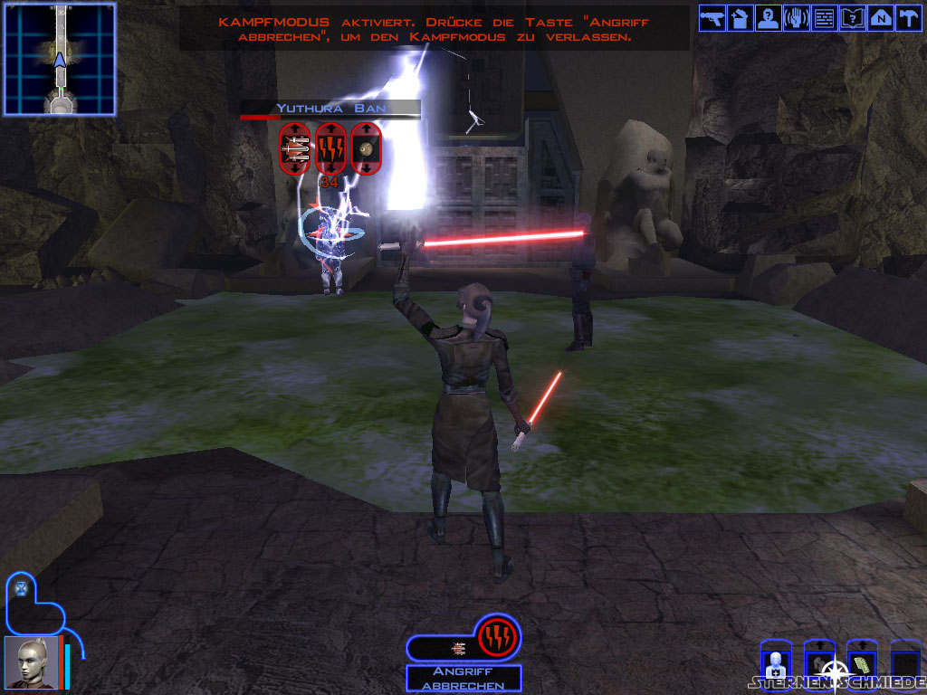 Fangt damit an Machtimmunität und Ritter-/Meister-Geschwindigkeit anzuwenden, gefolgt von eurem Energieschild. Im Anschluss versucht ihr einen oder am Besten beide mit Machtwellen zu betäuben. Während sie gelähmt sind, sollte es euch möglich sein, zumindest einen von ihnen zu töten. Wiederholt es um Yuthura/Uthar ebenfalls auszuschalten.