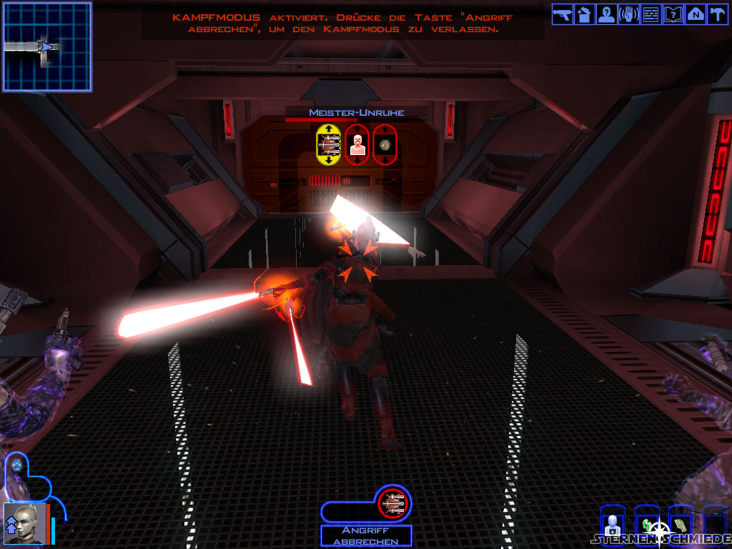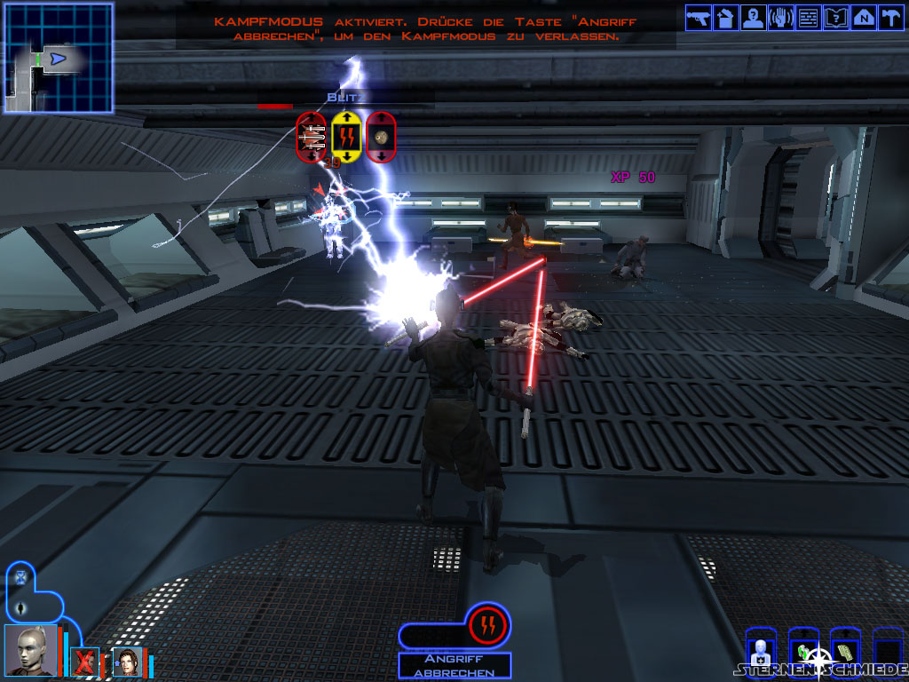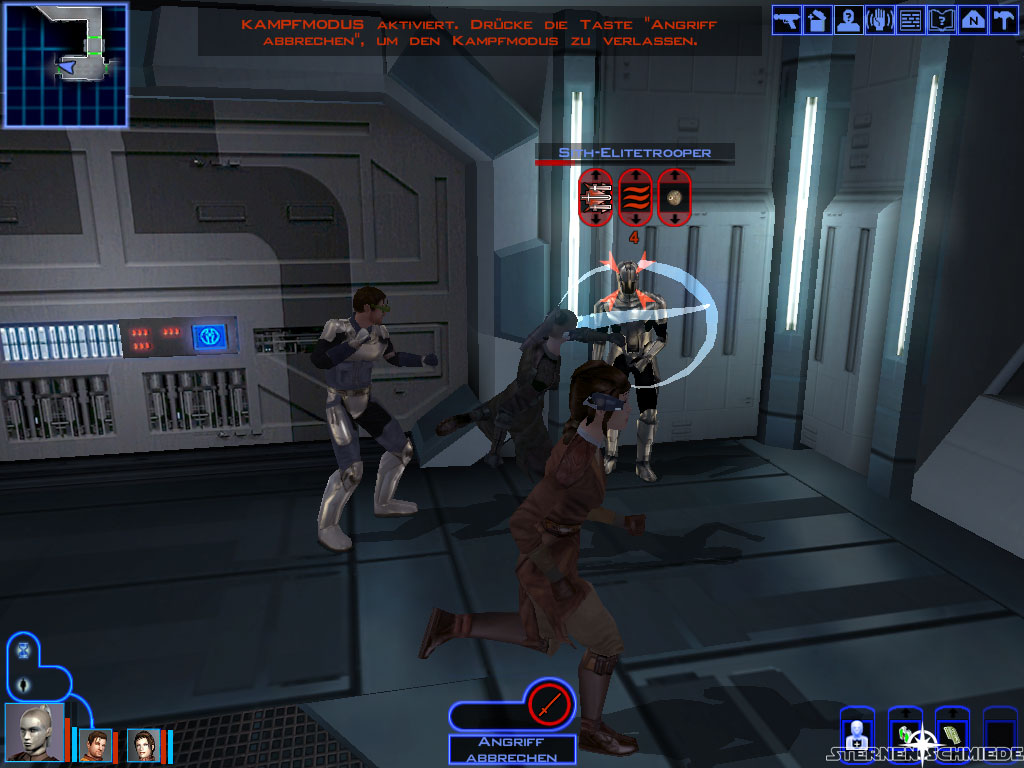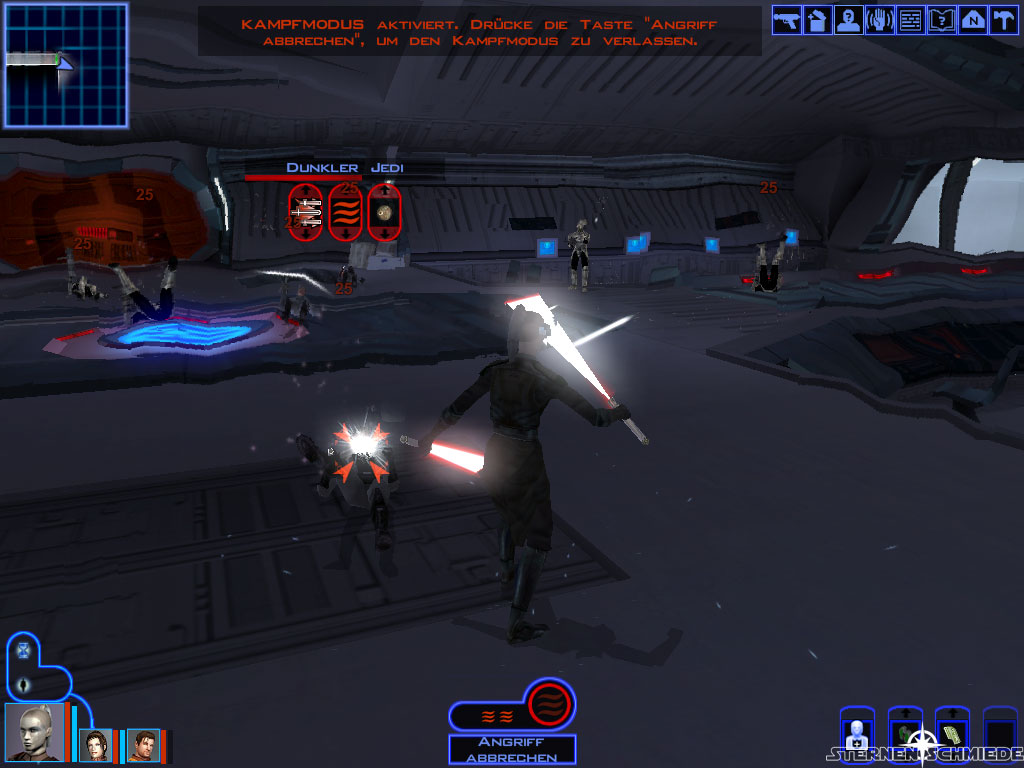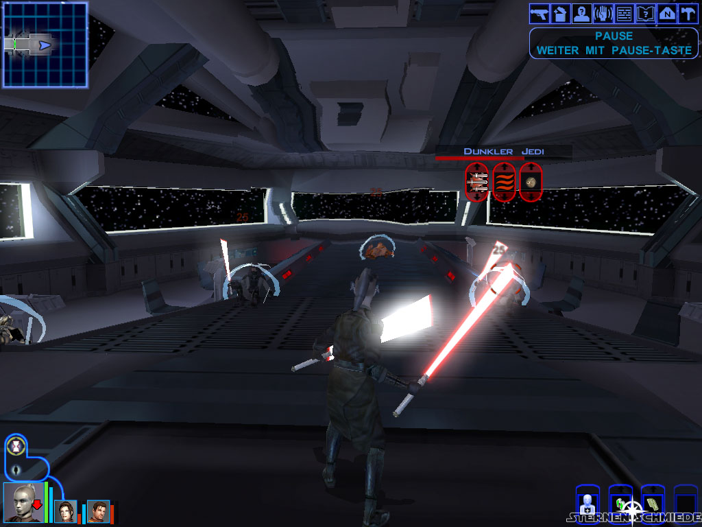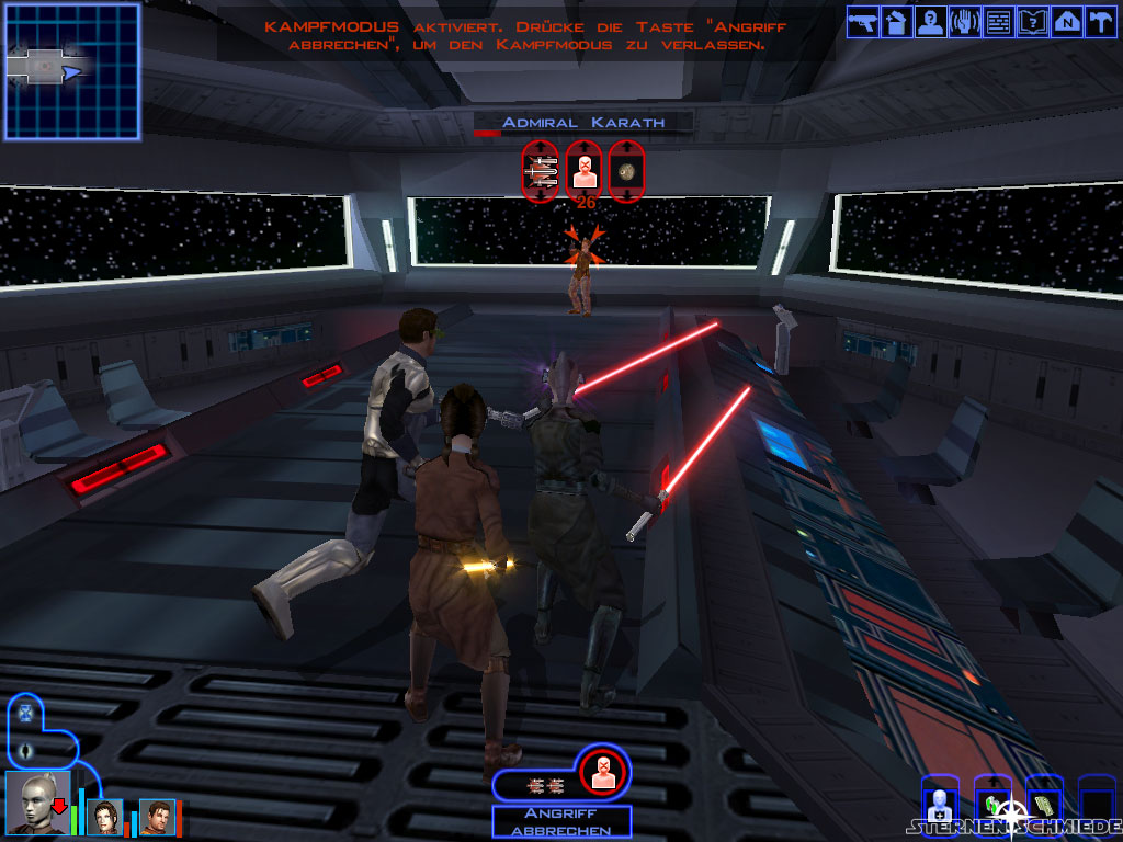 Bevor ihr nun die Brücke selbst (5) betretet, solltet ihr unbedingt abspeichern, denn der Kampf ist nicht einfach. Mit ein bisschen Planung aber durchaus machbar. Bringt die üblichen Verteidigungsmechanismen zum Einsatz (Schilde einschalten, Machtimmunität etc.) und geht sodann hinein. Es folgt zunächst eine kurze Einleitungsrede von Saul Karath. Anschließend entbrennt der Kampf. Ihr solltet möglichst einen eurer Mannen dazu abstellen, die zwei Soldaten hinter euch aufzuhalten. Der Rest kann sich um die eigentliche Bedrohung vor euch kümmern und diese am Besten erst einmal mit 1 oder 2 Termaldetonatoren (solltet ihr in der Waffenkammer gefunden haben) eindecken. Danach solltet ihr euch mit eurem stärksten Charakter (oder zweien) auf die Dunklen Jedi (und Saul Karath, falls er noch lebt) werfen. Die verbleibenden Truppen werden versuchen euch mit Granaten daran zu hindern. Friert sie vorübergehend ein oder streckt sie mit anderen Granaten nieder.