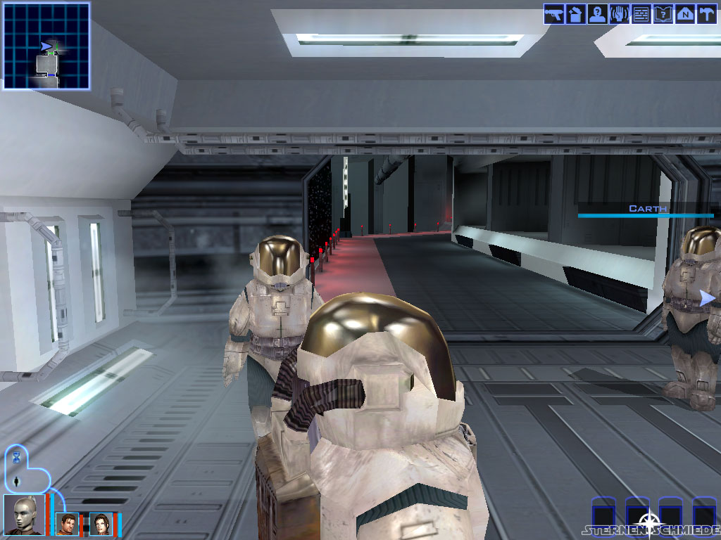 Wenn euer Spaziergang abgeschlossen ist und ihr wieder normal atmen könnt, ist es an der Zeit eure Waffen wieder anzulegen. Da diese scheinbar nicht in den Raumanzug passten. Denn hinter der nächsten Tür stehen bereits ein paar Sith Wachen. Nehmt die verbleibende Tür (nach Osten) und folgt dem Verlauf des Ganges hinauf zum Vorraum der Brücke (4). Im Inneren erwarten euch 5 schwere Sith Soldaten.