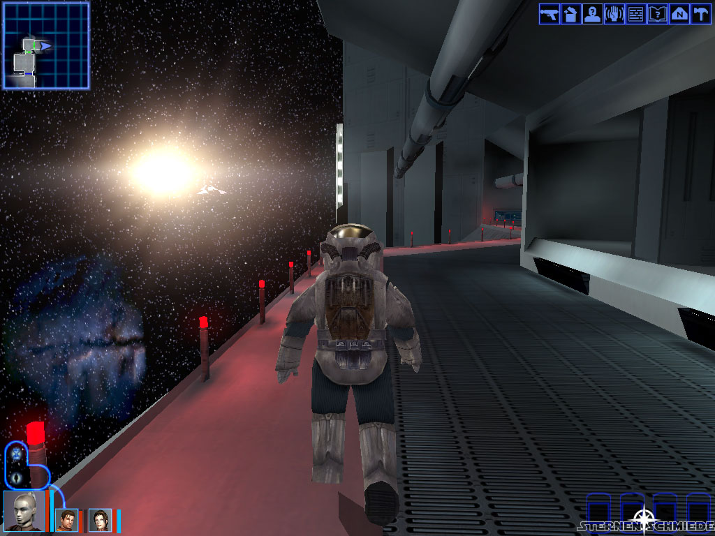 Euer Ziel ist selbstverständlich die Brücke (6). Hierzu könnt ihr entweder außen rum (erste Abzeigung rechts und dann immer dem Verlauf des Ganges folgen) gehen, oder euch durch die vor euch liegenden Räume (2, 5 und 7) kämpfen. Letzterer Weg ist sicherlich beschwerlicher, bringt logischerweise aber mehr Erfahrungspunkte. Auf dem Rundkurs erwartet euch nur sofort zur Rechten eine Wache und vor der Brückentür selbst (6). Bedauerlicherweise müsst ihr an der Brückentür (6) feststellen, dass diese versiegelt ist. Die Alternative heißt Luftschleuse (1). Hierzu braucht ihr jedoch zunächst einen Raumanzug aus der Waffenkammer (8).