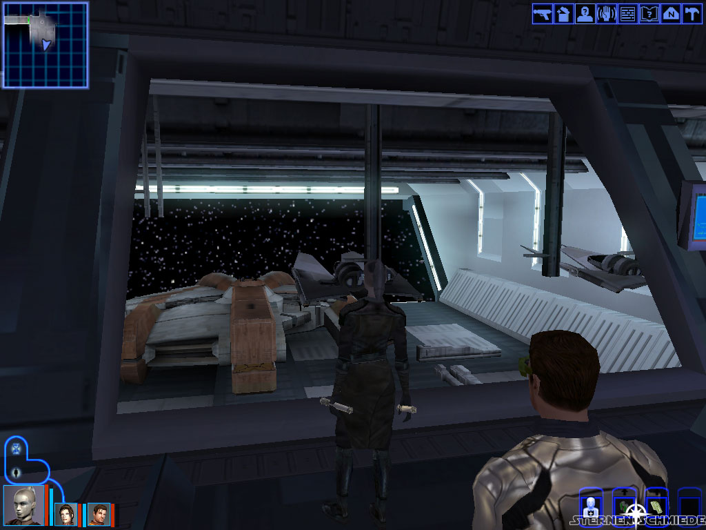 Verlasst den Aufzug nach Osten. Canderous wird euch daraufhin eine Mitteilung schicken, in der er euch mitteilt, dass der Ebon Hawk klar zum Start ist. Nach der kurzen Unterhalten geht es weiter in Richtung Osten (3). Die beiden Räume links (1) und rechts (7) könnt ihr getrost ignorieren. Sie enthalten lediglich Sith Truppen (1) und drei dunkle Jedi (7). Gebt acht, bevor ihr die Feuerschutztür (zu Raum 3) öffnet, hinter ihr erwarten euch zahlreiche Dunkle Jedi und Sith Soldaten. Durch das Fenster des Raumes könnt ihr den Ebon Hawk bereits sehen. Das heißt aber nicht, dass er schon in greifbarer nähe ist. Durchsucht die Container und Überreste der Gegner und speichert ab, bevor ihr die Tür auf der gegenüberliegenden Seite durchschreitet.
