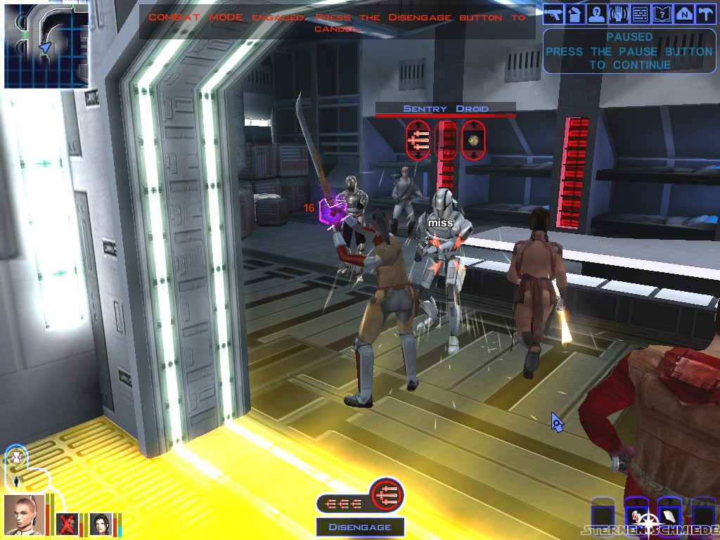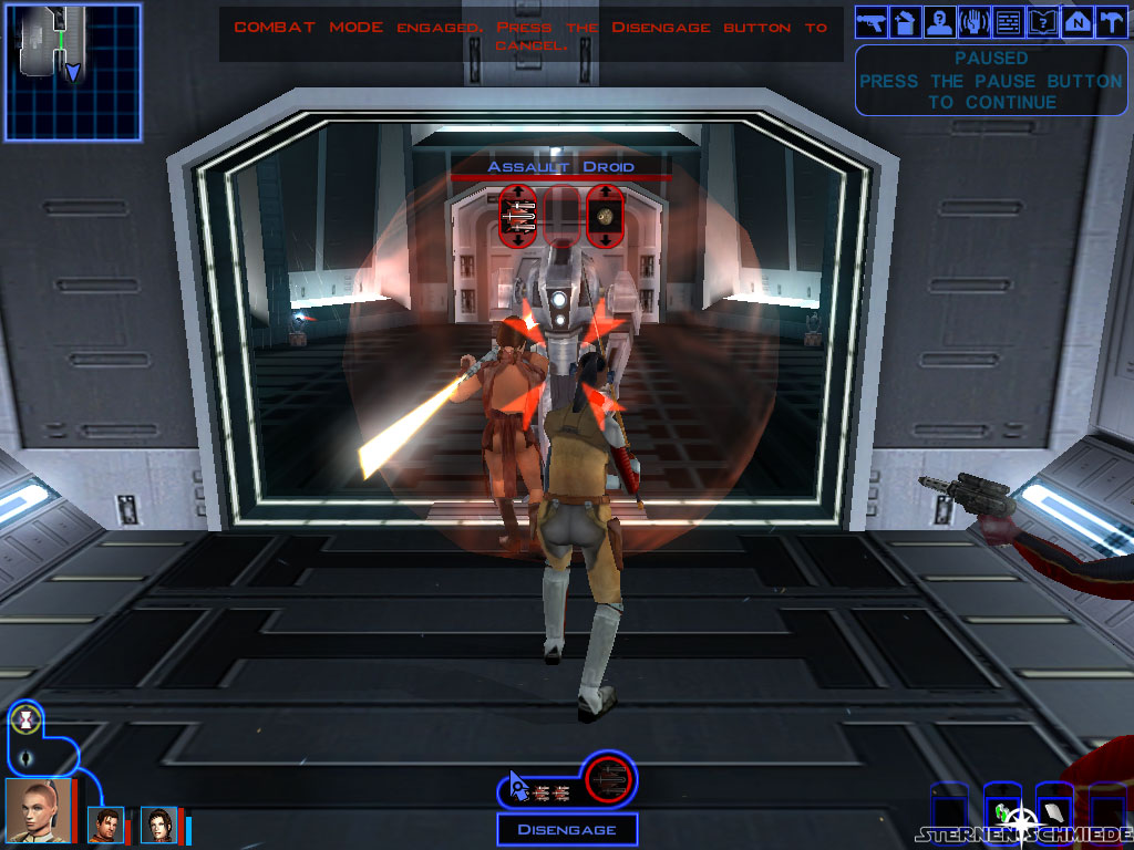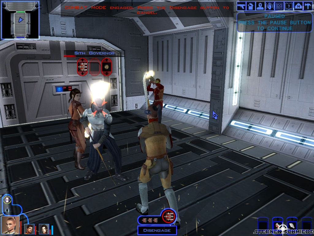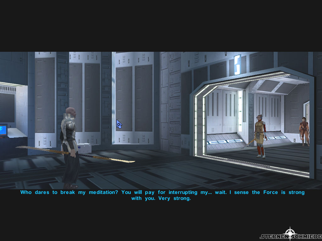 Oben angelangt müsst ihr euch für den wirklich großen Kampf vorbereiten. Hinter der nächsten Tür wartet der Sith Endgegner. Seine Bemerkung, dass ihr ihn unterbrochen habt, wird euch sicherlich nicht interessieren. Aber das er euch für einen Macht Adepten hält ist schon eher erwähnenswert. Sagt ihm, er solle sich von der dunklen Seite abwenden (worauf er natürlich nicht hört). Stattdessen freud er sich, weil er für euren Kopf ein Laserschwert bekommen wird. Aber da habt ihr auch noch ein Wörtchen mitzureden ;) Versucht ihm wie üblich mit Unruhe bei zu kommen. Aber achtet bei ihm darauf, dass eure Trefferpunkte nicht zu weit sinken. Heilt euch immer rechtzeitig, denn sollte er euch lähmen, während ihr nur noch wenig Lebenskraft habt, ist das euer sicherer Tod. Er hat außerdem die dumme Angewohnheit sich selbst zu heilen, wenn er nur noch über wenig Trefferpunkte verfügt.