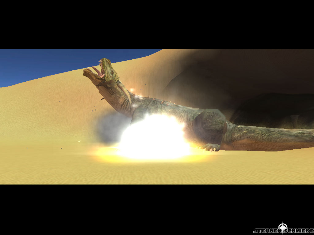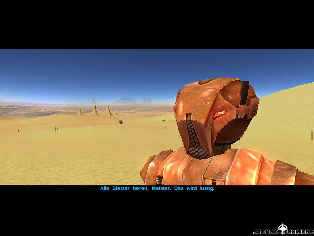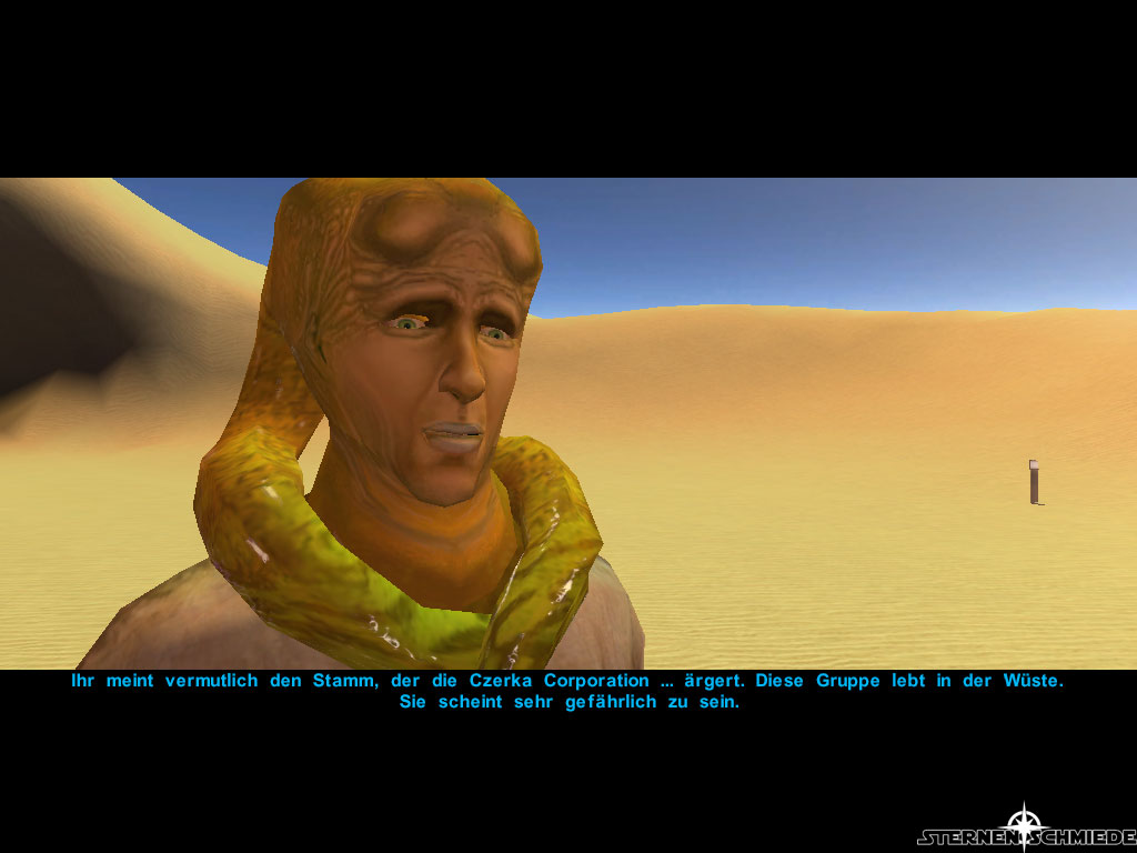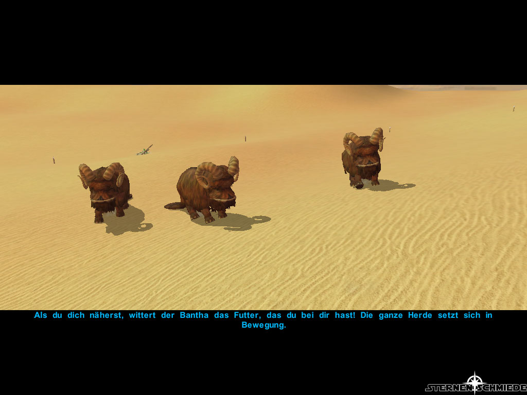 Er wird es euch sodann erläutern. Willigt ein, da er in der Tat Plan hat. Der Plan besteht darin, den Drachen aus der Höhle zu locken und dort zu überfallen. Da ihn seine Haut jedoch Immun gegen Blasterfeuer macht, hat Komad den Eingangsbereich der Höhle mit Minen ausgelegt. Das Problem liegt also nur noch darin, dass Monstrum heraus zu locken. Was ihr wiederum mit einem wohlschmeckendem Köder macht: Banthas. Bantha-Futter solltet ihr ja bereits genügend von den Sandleuten bekommen haben. Falls ihr den Augenblick verpasst habt, verkauft der Händler am Czerka-Raumhafen euch welches. Die Aufgabe besteht also nur noch darin die Banthas mit dem Futter zur Höhle zu führen. Leider haben die Sandleute jedoch ein Problem damit. Denn sie sehen die Banthas als heilige Tiere an. Ihr solltet also mit Angriffen rechnen, wenn ihr versucht die Tiere zu füttern.