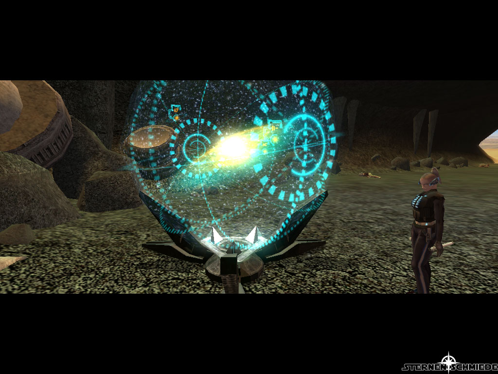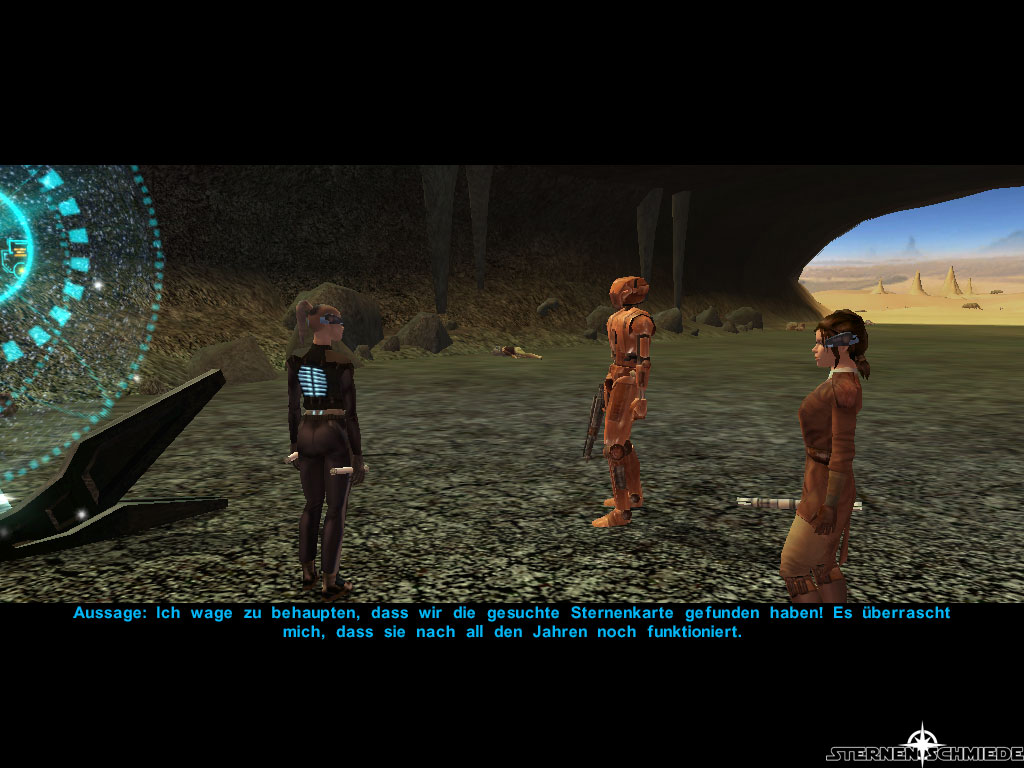 Damit ihr die Arbeit jedoch noch nicht getan. Betretet die Höhle und durchsucht die Leiche von Komads Partner. Neben dem üblichem Kram, findet ihr bei ihm auch eine Jedi Meister Robe. Knapp dahinter liegt ein Haufen mit einem violettem Kristall und auf der gegenüberliegenden linken Seite Opila Kristall. Zur Linken der Sternenkarte befindet sich eine Tasche mit einem Hologramm. Welches Bastilas Vater gehörte und somit teil von Bastilas Sidequest ist. Wählt die Sternenkarte an (2000 XP).