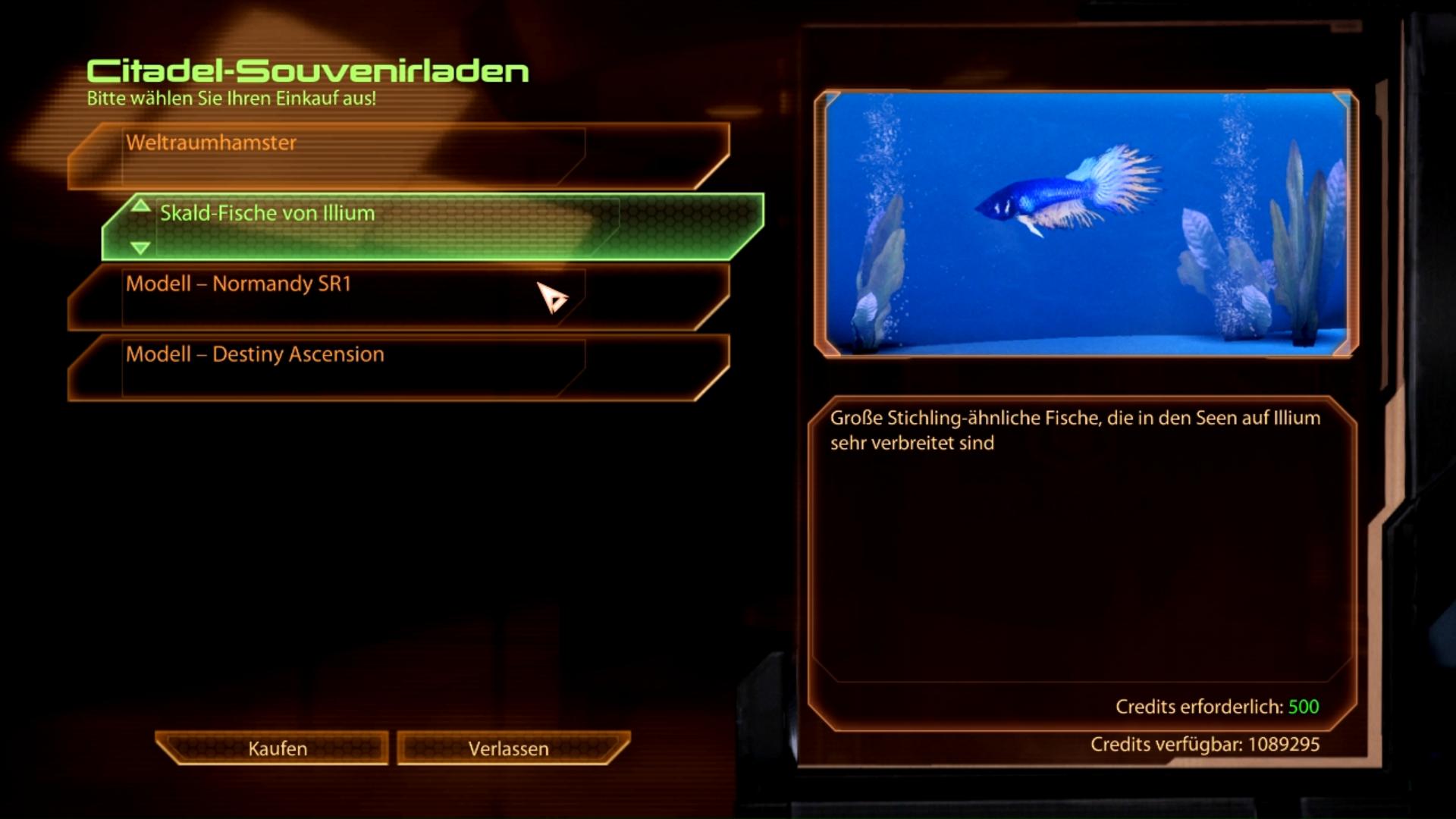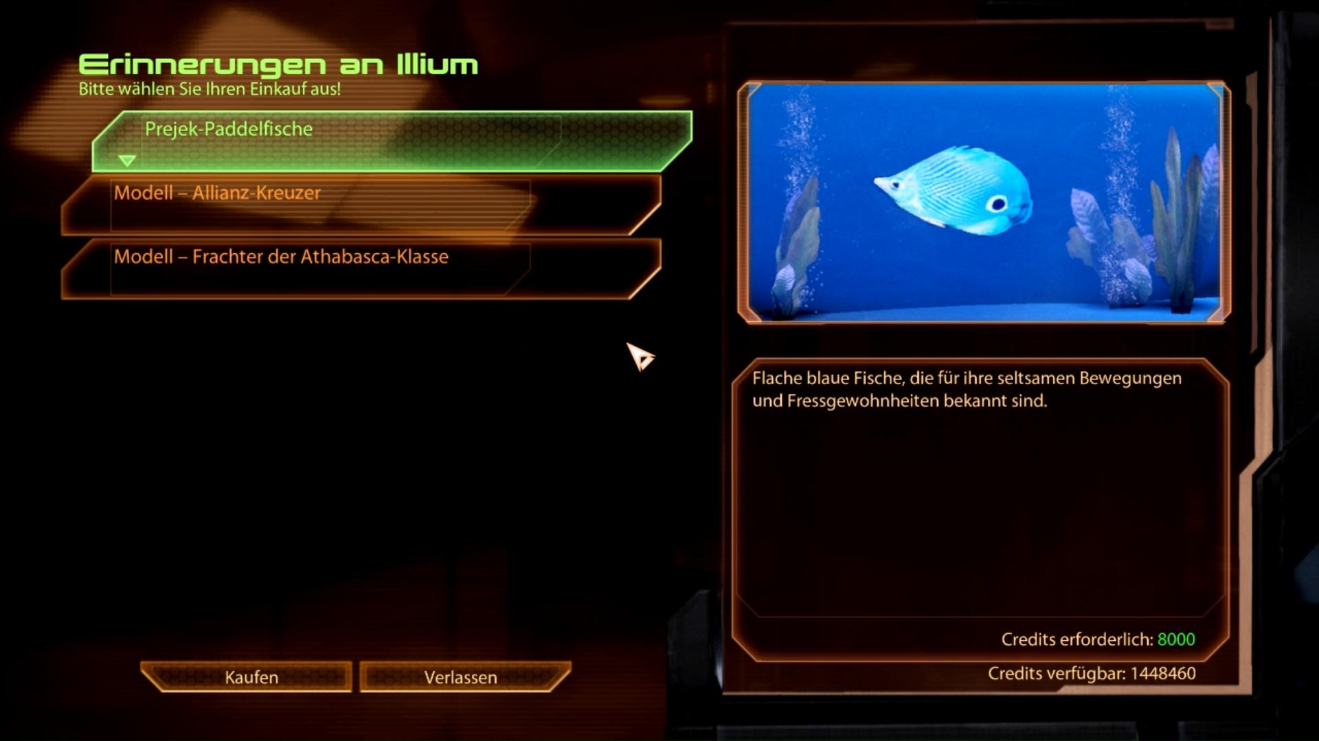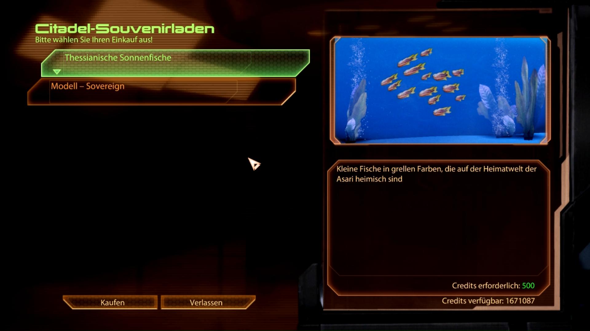 Fundort: Können für 9.200 Credits bei Citadel-Souvenirs auf der Citadel Station gekauft werden. Sind für den "abtrünnigen" Lösungsweg der "Kroganer-Sushi" Quest gedacht, bei dem ihr Kargesh erzählt, ihr hättet die Fische im Wassertank der Citadel gefangen.