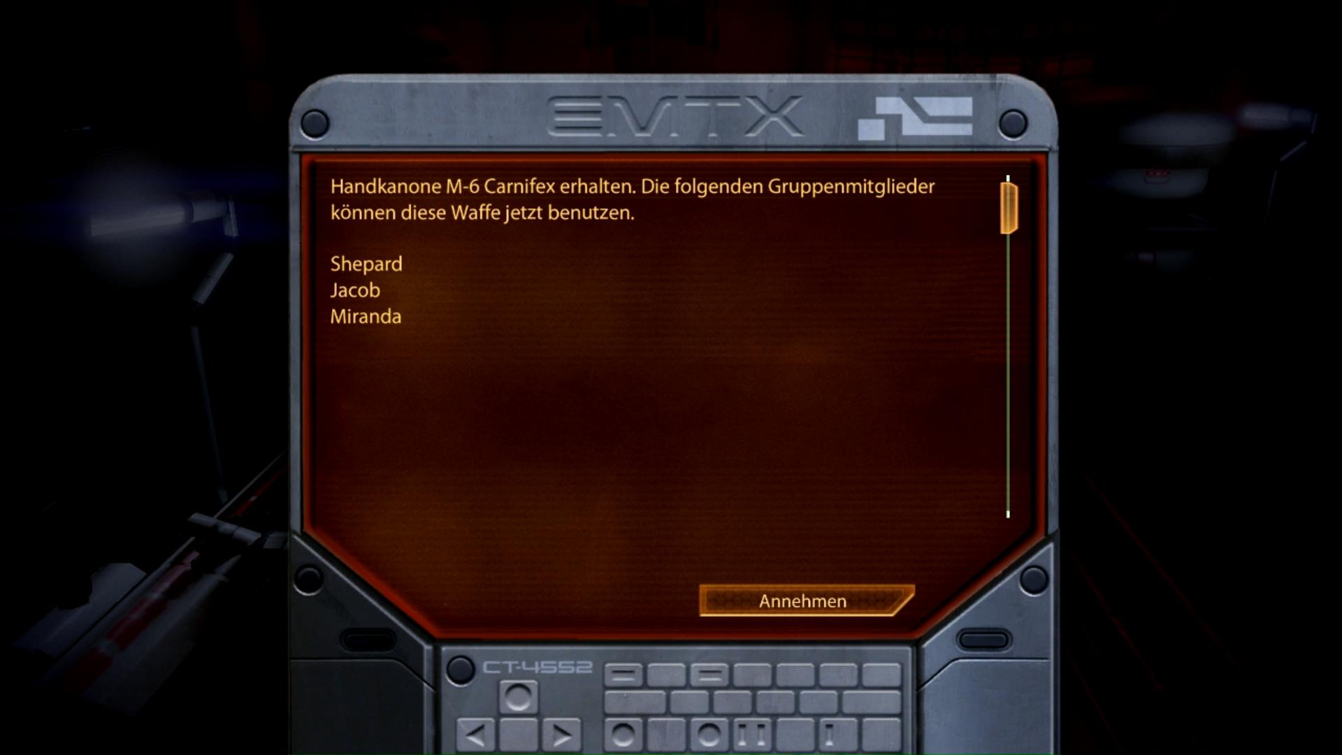 - Fundort: Kann während der Dr. Mordin Solus Akquirierung-Mission ("Dossier: Der Professor") auf Omega gefunden werden. Mordin gibt euch die Pistole automatisch zusammen mit dem Heilmittel, wenn er euch losschickt seinen Gehilfen Daniel zu suchen und das Heilmittel zu verteilen.