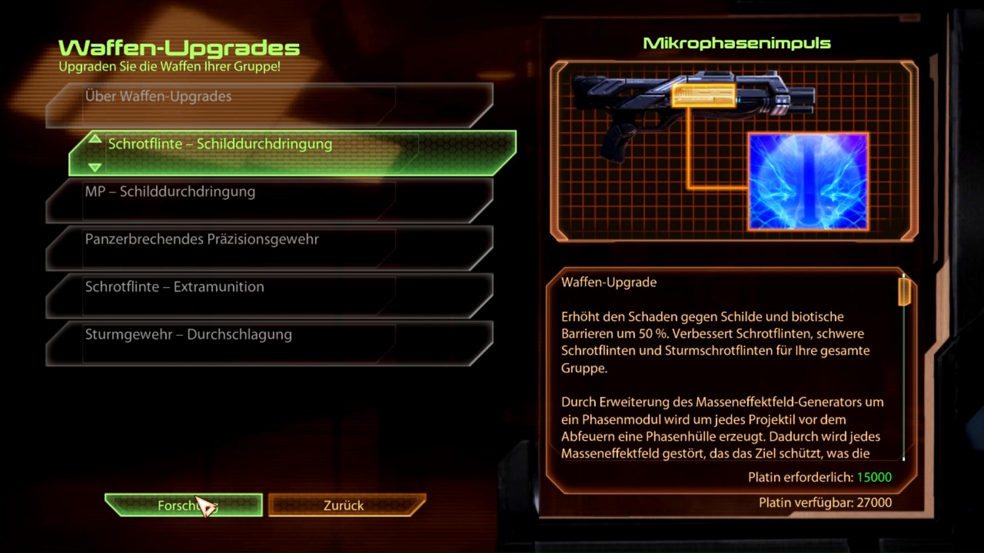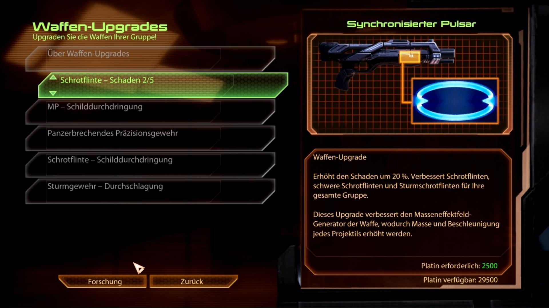 Effekt: +50% Schaden gegen Schilde/Barrieren Forschungskosten: 15.000 Platin Planet: Normandy Fundort: Wird automatisch an der Forschungsstation der Normandy freigeschaltet, sobald zwei Schrotflinten-Upgrades erforscht wurden.