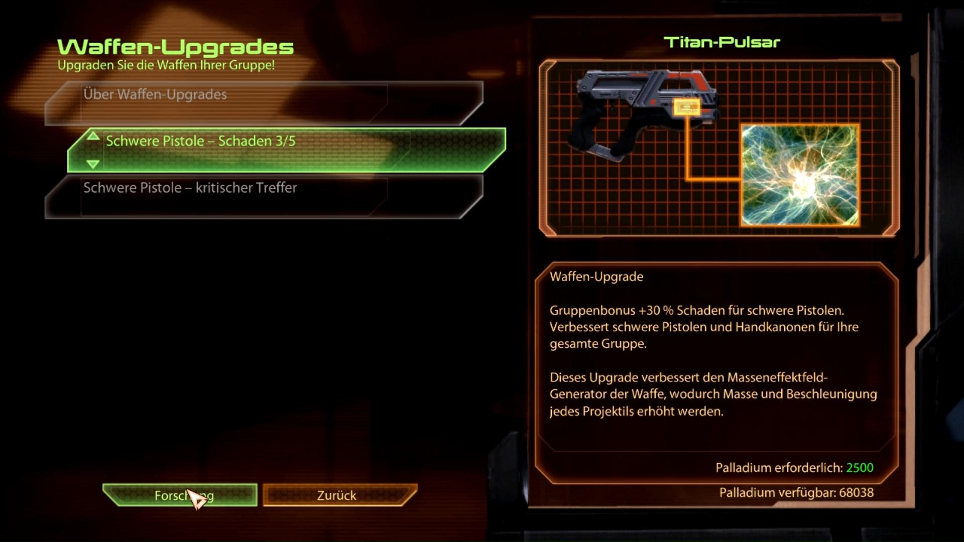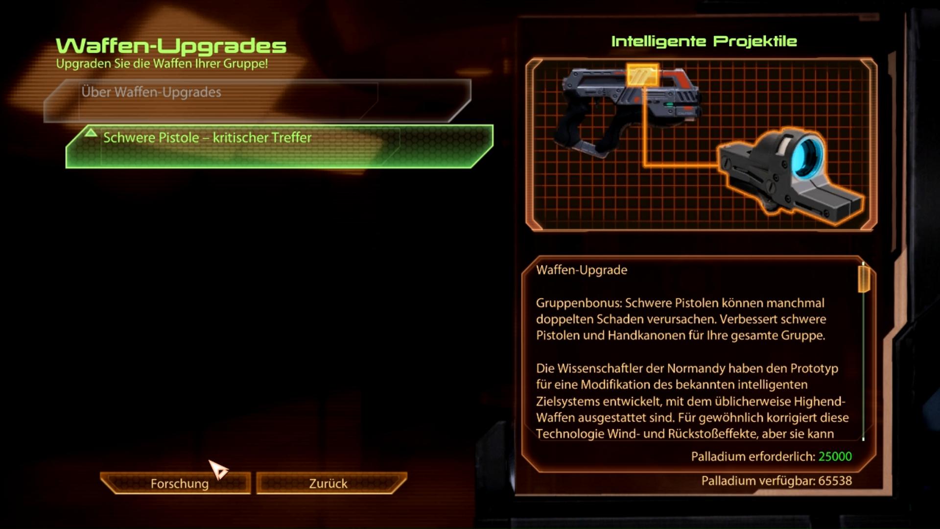 - Fundort: Wird automatisch an der Forschungsstation der Normandy freigeschaltet, sobald drei Schwere-Pistole-Schaden-Upgrades erlangt wurden.