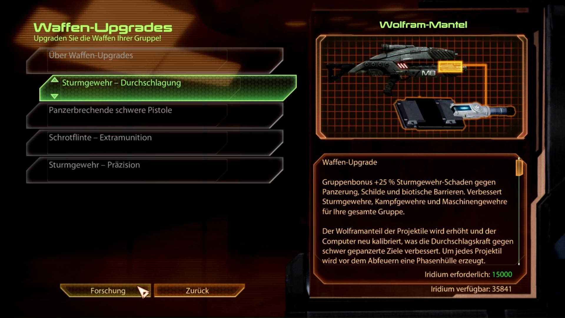 Effekt: +25% Schaden gegen Panzerung/Schilde/Barrieren Forschungskosten: 15.000 Iridium Planet: Normandy Fundort: Wird automatisch an der Forschungsstation der Normandy freigeschaltet, sobald zwei Sturmgewehr-Schaden-Upgrades erforscht wurden.