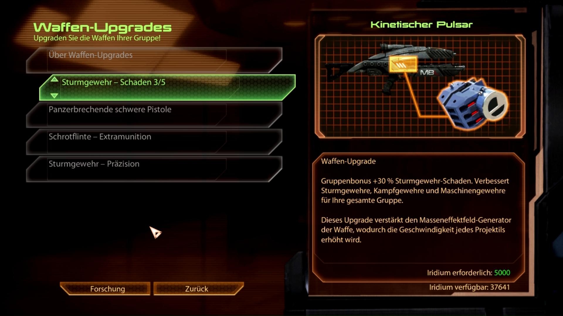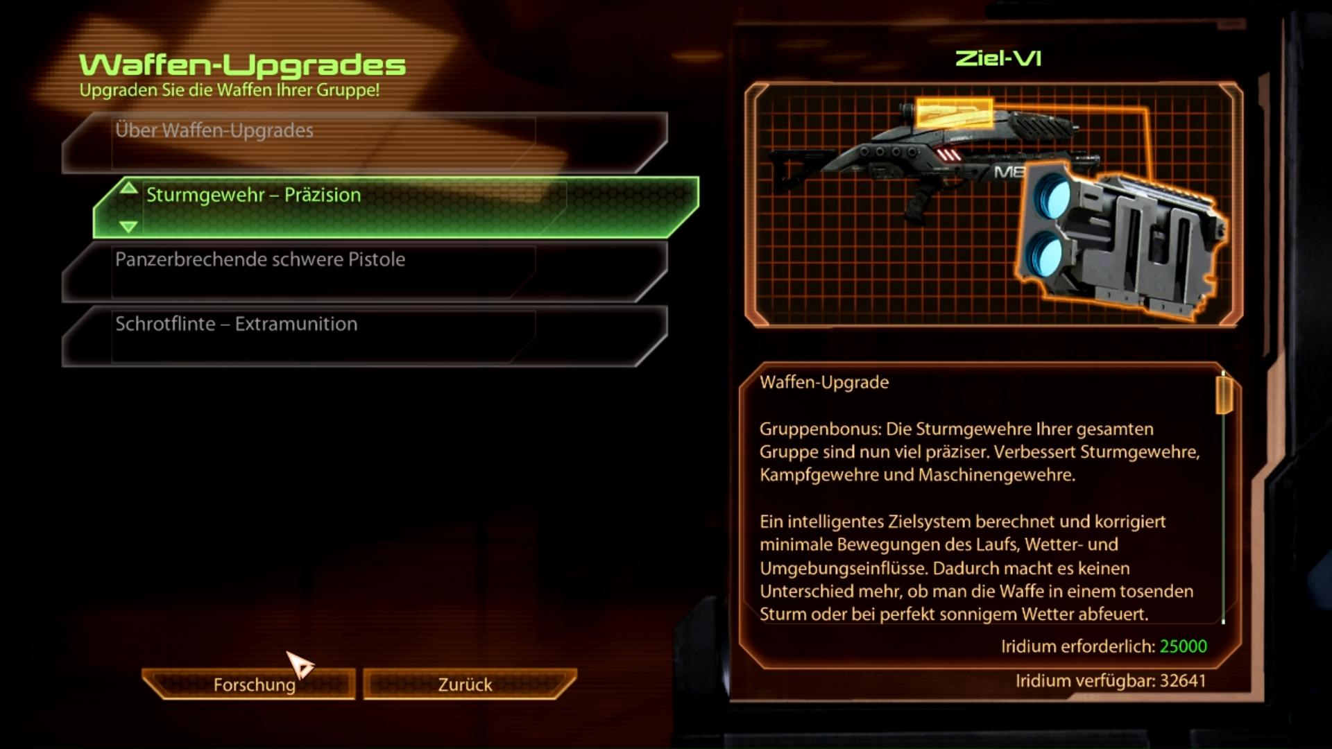 Effekt: Nicht weiter spezifizierter Genauigkeitsbonus Forschungskosten: 25.000 Iridium Planet: Normandy Fundort: Wird automatisch an der Forschungsstation der Normandy freigeschaltet, sobald drei Sturmgewehr-Schaden-Upgrades erlangt wurden.