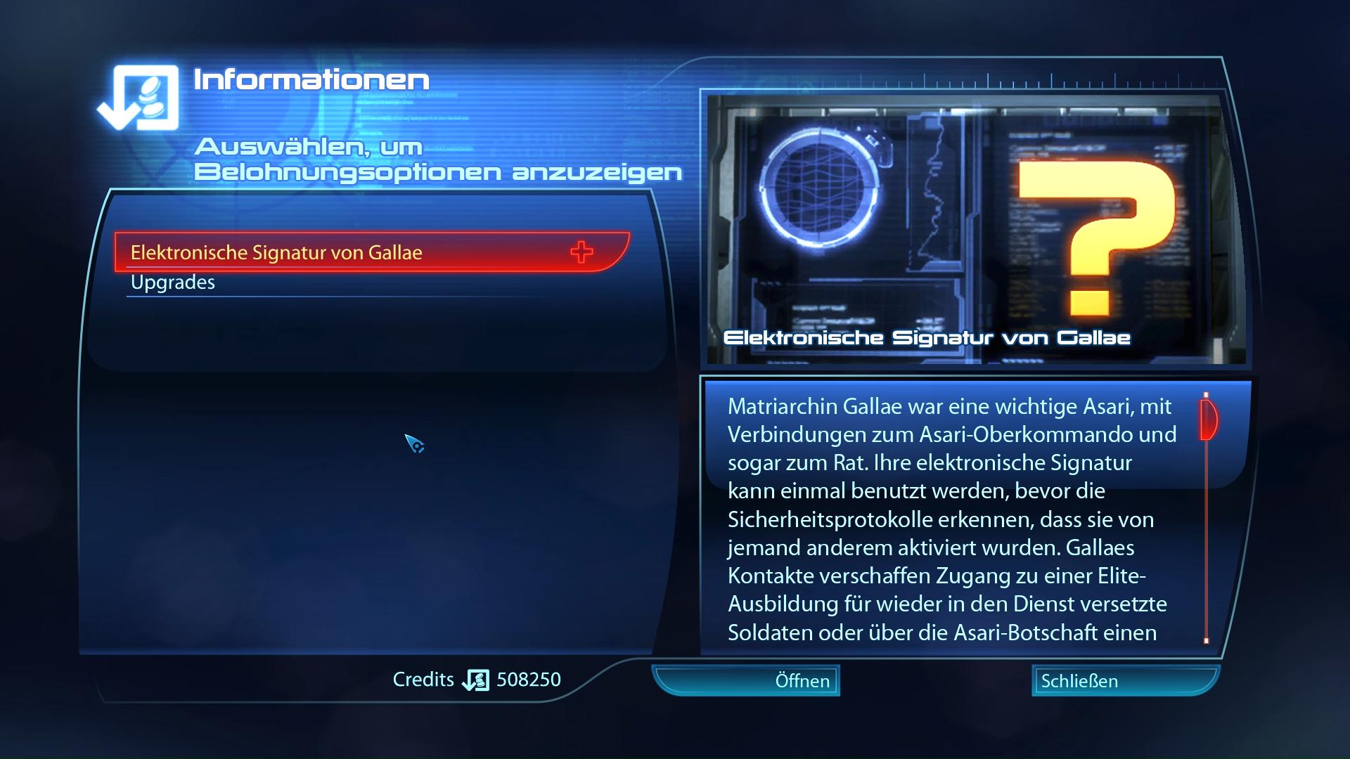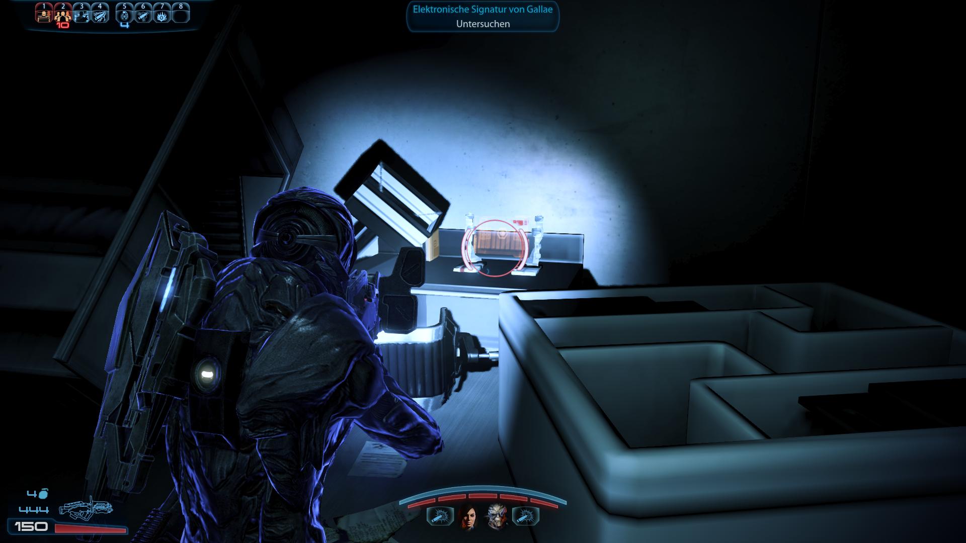 Fundort:Im Asari-Raum könnt ihr nach der "Priorität: Citadel (II)" Mission das Ardat-Yakshi Kloster auf Lessus besuchen. Nach der Landung, müsst ihr über Leitern den Fahrstuhlschacht hinab klettern und landet dann in einer unbeleuchteten Halle. Vom Fahrstuhlschaft aus geht es rechts durch die Tür weiter. Auf der linken Seite hingegen findet ihr eine kleine Kammer mit einem Computer-Terminal, von dem ihr die elektronische Signatur von Gallae herunterladen könnt.