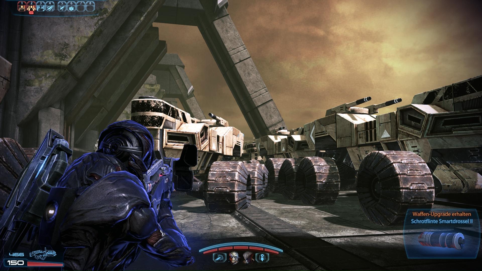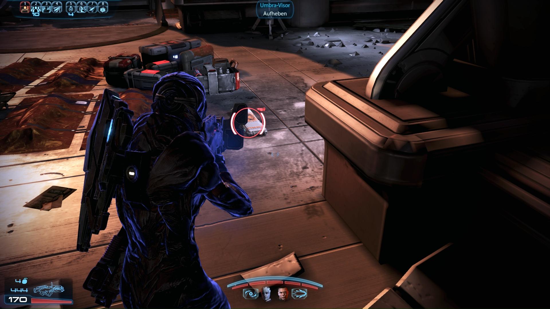 Fundort:Umbra-Visor könnt ihr sofort in der Landezone von Thessia aufsammeln. Lauft vom Shuttle aus nicht nach links zur Barrikade, sondern leicht rechts. Dann seht ihr den Koffer bereits am Boden liegen.