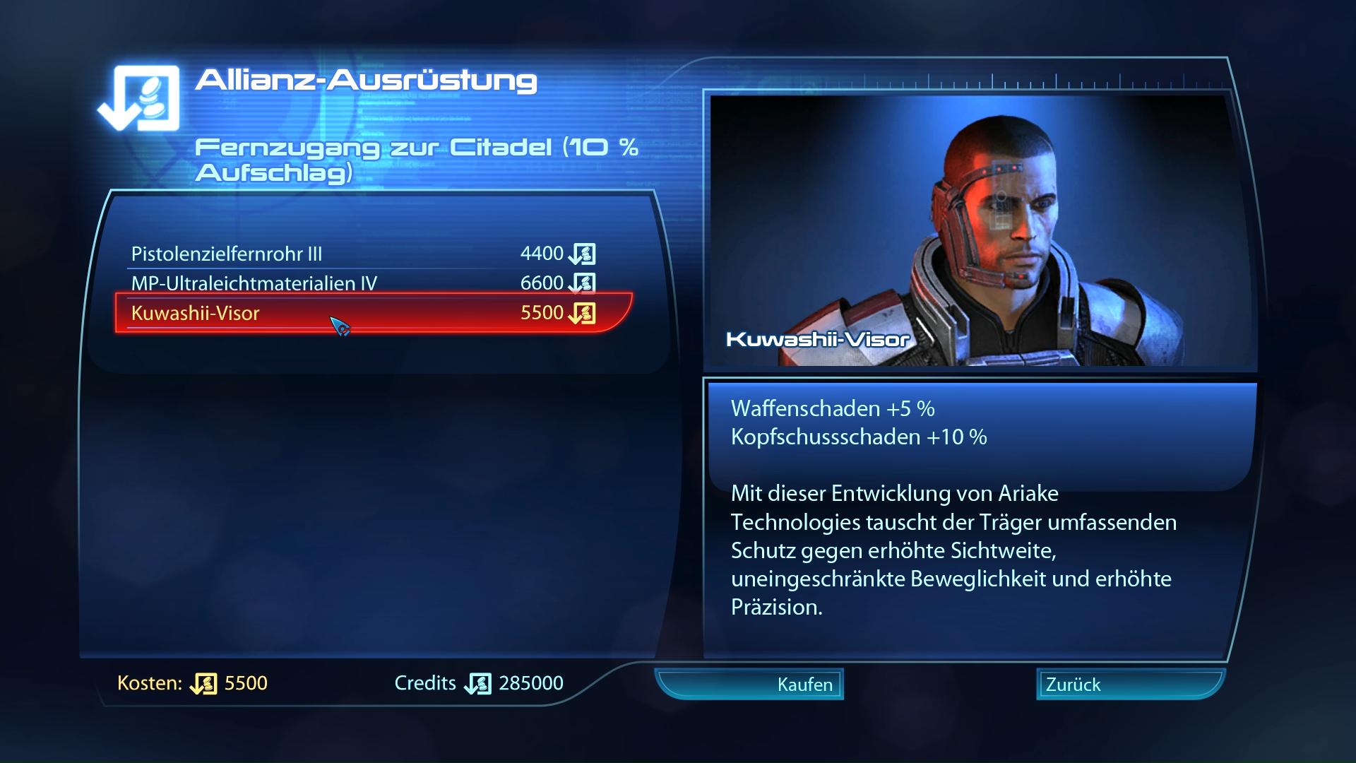 Fundort:Der Kuwashii-Visor kann mit Abschluss der 4. Hauptgeschichtsmission "Priorität: Tuchanka" für 5.000 Credits bei der salarianischen Firma Aeghor-Munition gekauft werden.