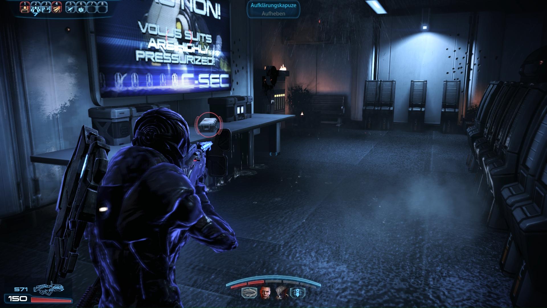 Fundort:Die Aufklärungskaputze könnt ihr im Verlauf des "Priorität: Citadel (II)" Einsatzes finden. Von Commander Baily aus geht ihr durch die nächste Halle mit Cerberus Wachen und biegt dort links ab, wo sich weitere Cerberus Truppen abseilen. Die doppelte Sicherheitstür bringt euch in einen Abschnitt, wo die Sprinkleranlage alles unter Wasser setzt. Gleich links hängt ein riesiges Display mit einem Tisch darunter, worauf die Aufklärungskaputze liegt.