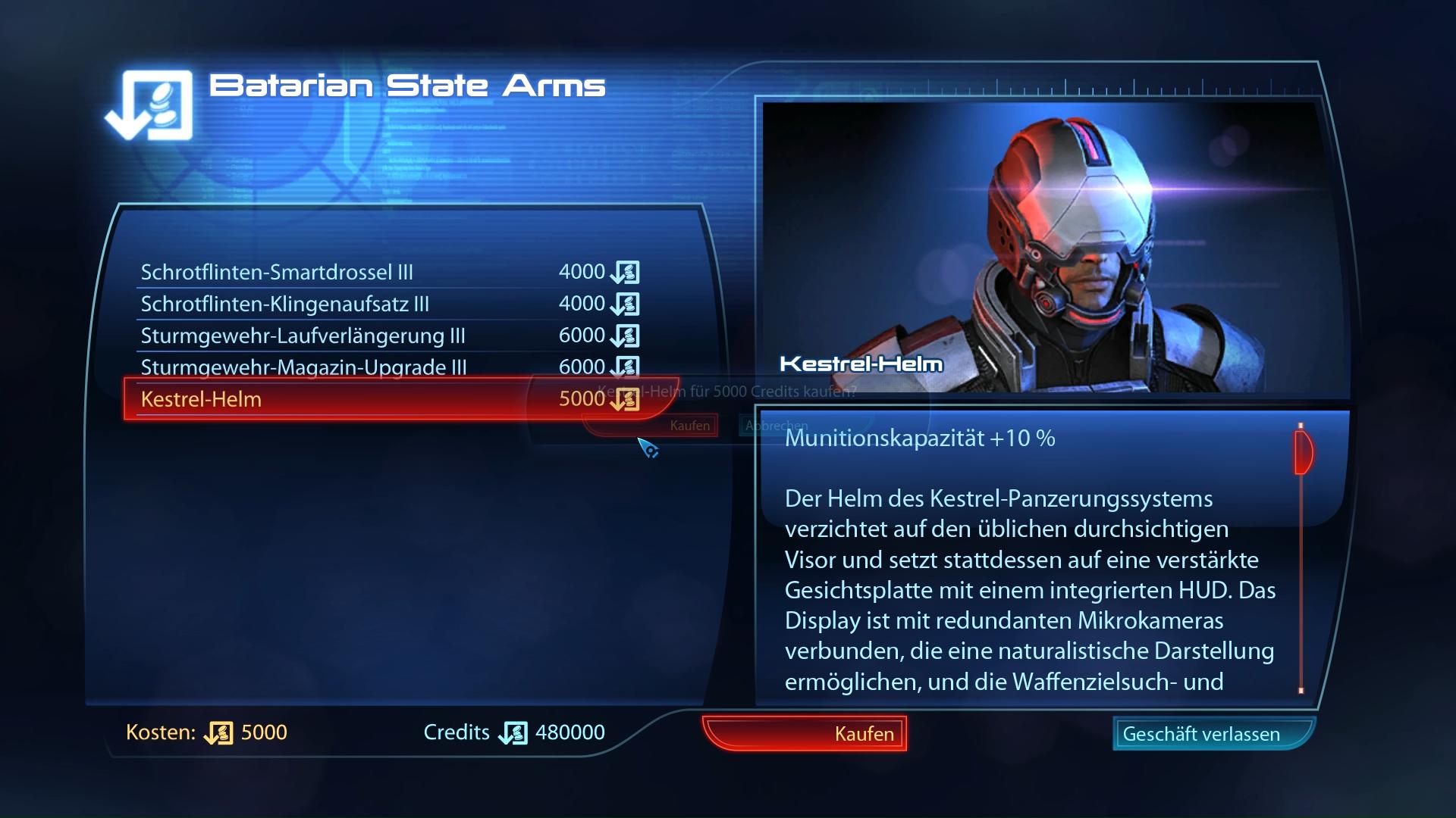 Fundort:Mit Beendigung der "Priorität: Citadel (II)" Mission könnt ihr bei Batarian State Arms im Docks Wartebereich der Citadel den Kestrel Helm für 5.000 Credits kaufen.