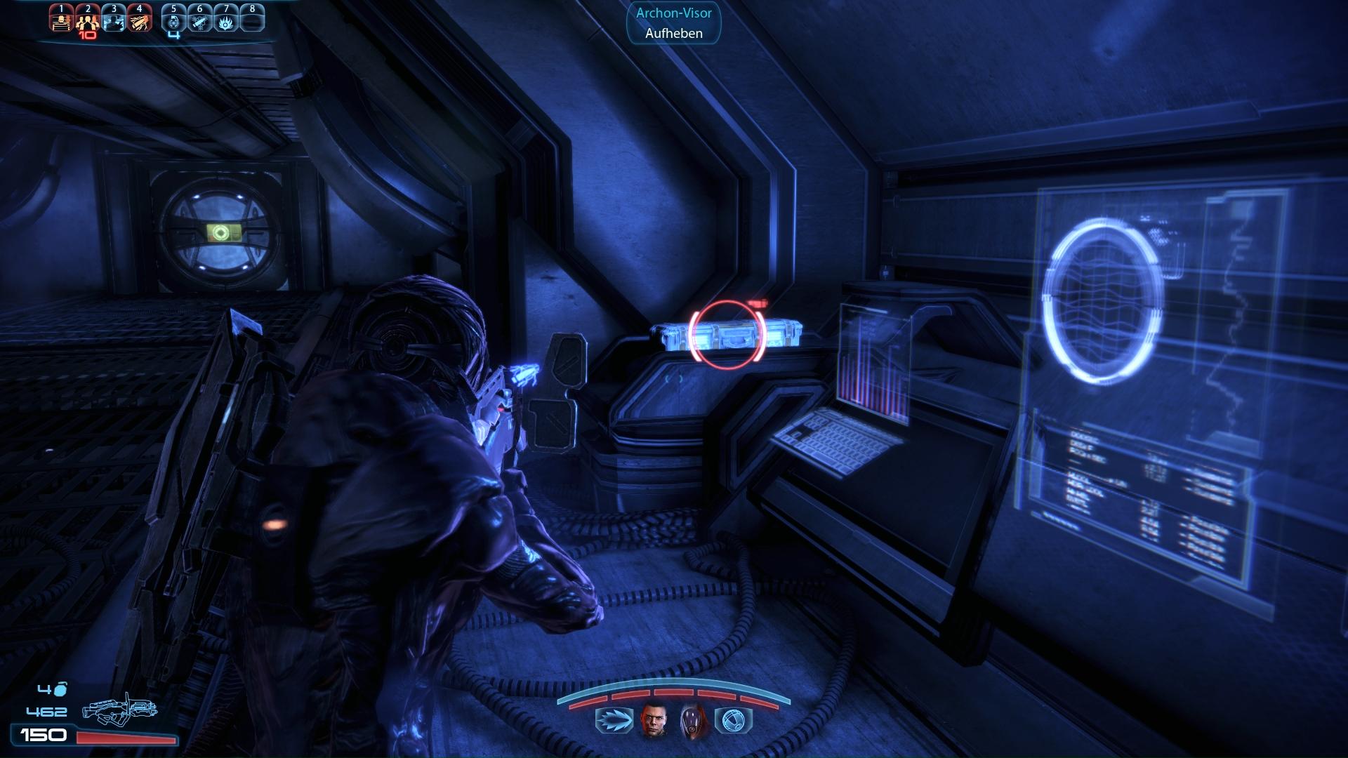 Fundort:Den Archon-Visor findet ihr auf dem Geth-Schlachtschiff, was die 6. Hauptgeschichtsmission von Mass Effect 3 ist. Nachdem ihr eure Squad rein geholt, die Guardian Defense Daten geborgen und durch den ersten Gang mit Stolperdrahtminen seid, kommt ihr zu zwei kurzen Kammern, die zur Kommandozentrale führen. In ersten der zwei Räume liegt der Archon-Visor gleich rechts bei der Signalkonsole. Der Hinweis auf den Kontrollraum, der ständig links eingeblendet wird, lenkt leicht davon ab, dass rechts etwas sein könnt.