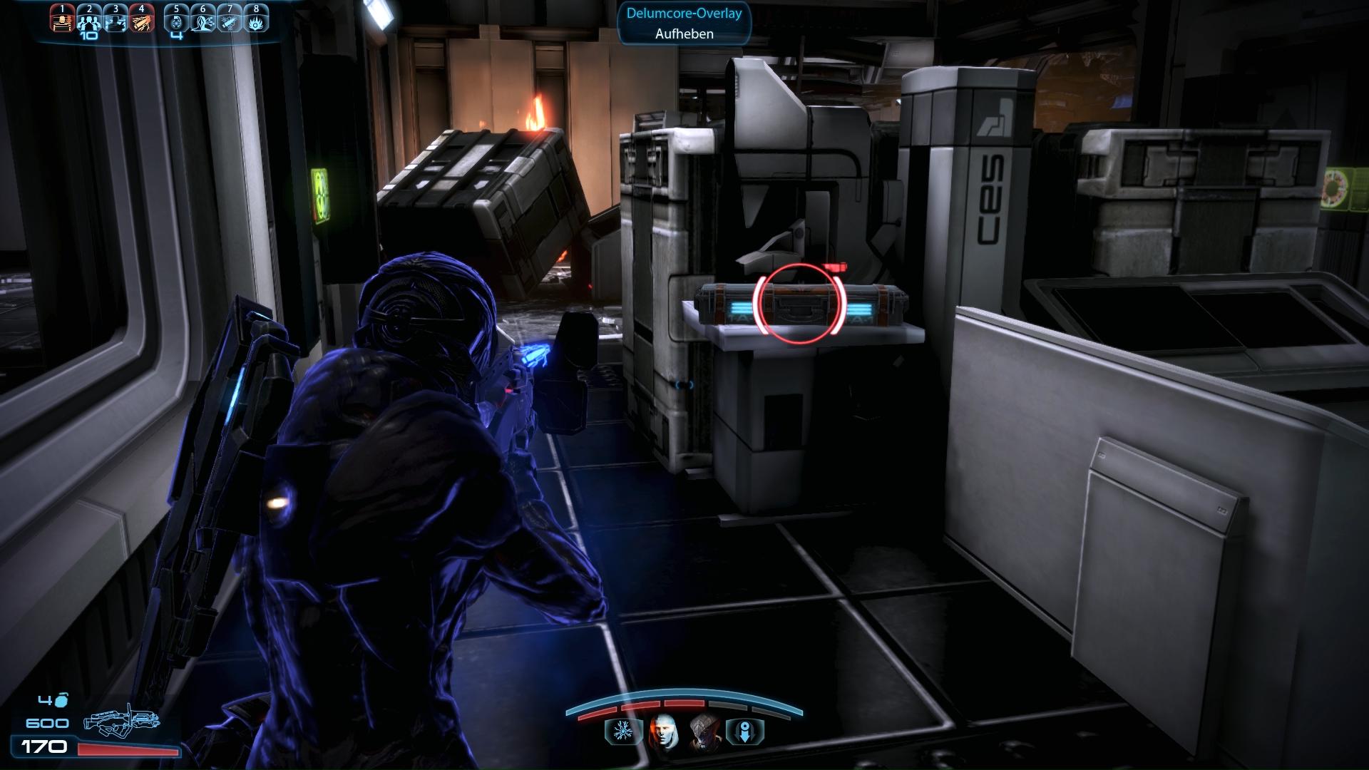 Fundort:Das Delumcore-Overlay lässt sich während der vorletzten Mission des Spiels, im Cerberus Hauptquartier erbeuten. Es liegt zwischen dem zweiten und dritten Video-Terminals im Laborabschnitt. Es ist relativ leicht zu verpassen, denn wenn ihr nach dem zweiten Terminal an den dunkelblauen zerstörten Schacht kommt, springt die Squad automatisch dort rein und ihr kommt zu den Überresten des Mass Effect 2 Reapers. Statt in den Schacht zu springen, müsst ihr geradeaus weiter gehen und dann rechts durch die Labortür. Geht im Labor auf die andere Seite der Kisten und ihr findet den Koffer mit dem Delumcore-Overlay.