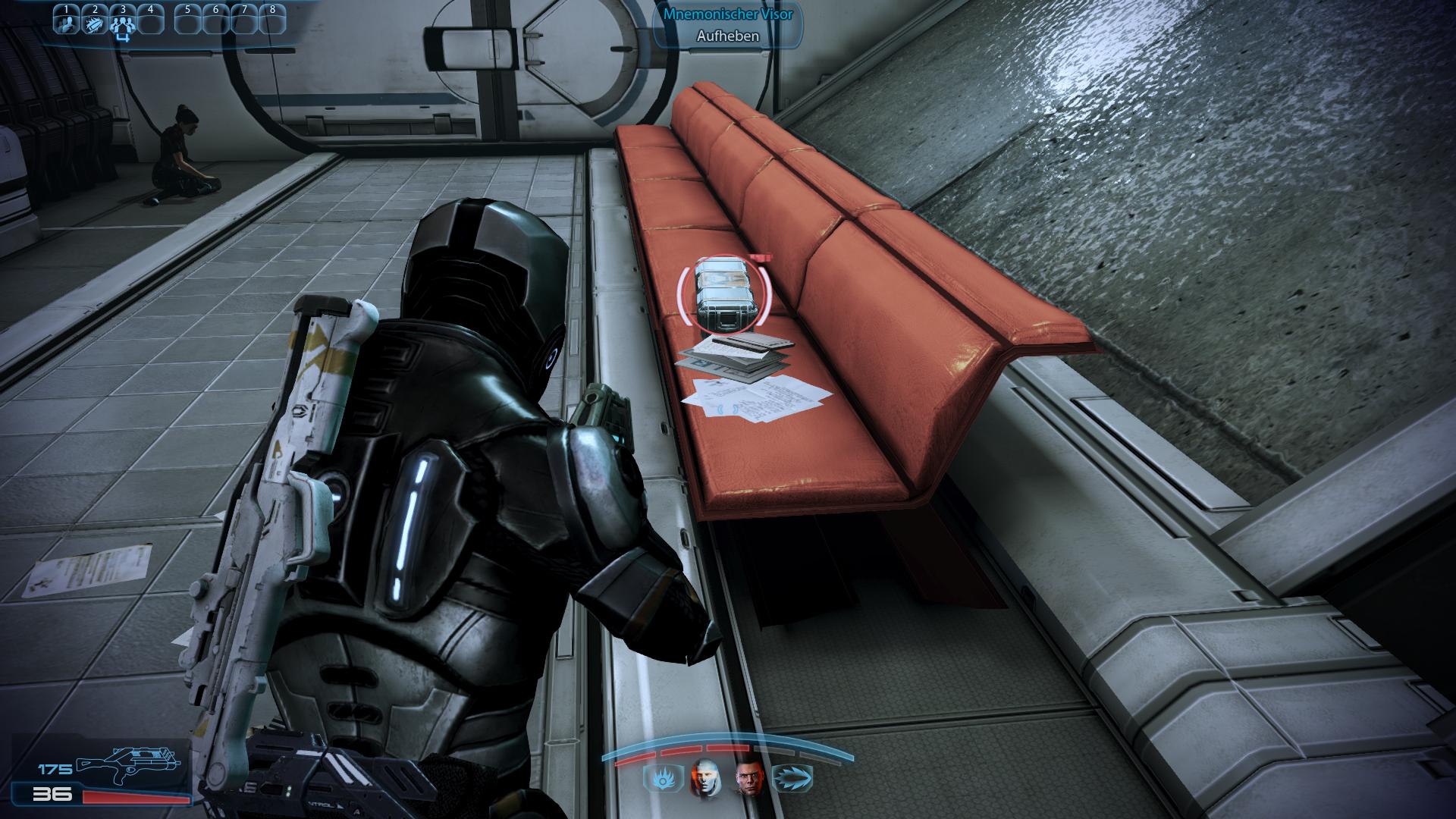 Die Kopfbedeckung befindet sich relativ am Anfang der Mission. Nachdem ihr bei Kahlee Sanders wart, mitansehen musstet wie Cerberus Soldaten einen Studenten wegschleifen und dann Reiley Bellarmine unter seiner Barriere vor zwei Cerberus Soldaten gerettet habt, kommen zwei Schulungsräume. Lauft durch beide durch und ihr gelangt in einen Gang, wo auf der Bank am gegenüberliegenden Ende der Mnemorische Visor liegt.