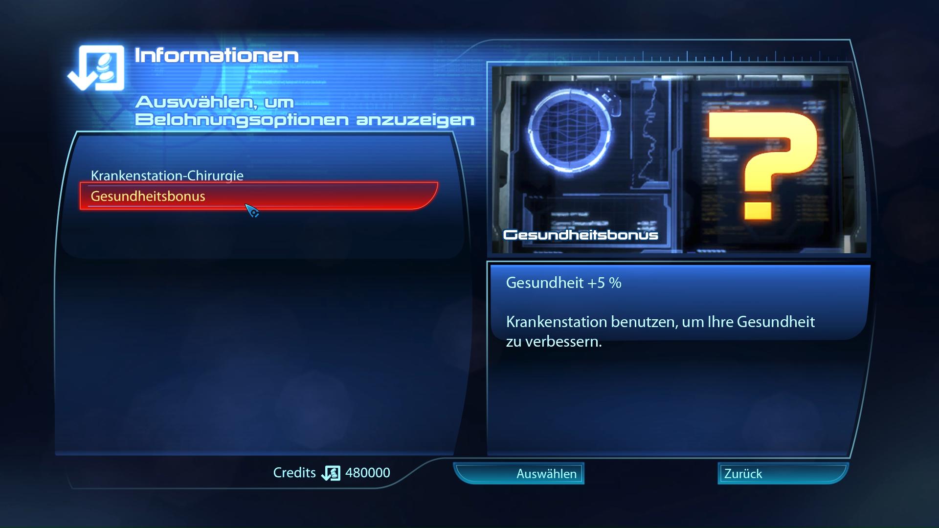 Fundort:Habt ihr Dr. Chakwas oder Dr. Michel für die Normandy angeheuert, gibt sie euch nach der "Priorität: Citadel (II)" Mission den "Citadel: Medizinische Vorräte" Auftrag (Citadel: Medical Supplies). Geht dazu, wie von der Ärztin vorgeschlagen zu Tacuts im Docks Wartebereich und verhandelt über den Austausch. Falls euch die moralischen Argumente fehlen, gebt die Vorräte einfach her. Anschließend könnt ihr an Bord der Normandy wieder mit Dr. Chakwas/Michel reden. Sie erhöht dadurch die Medigelkapaität und gibt euch außerdem dieses Upgrade.