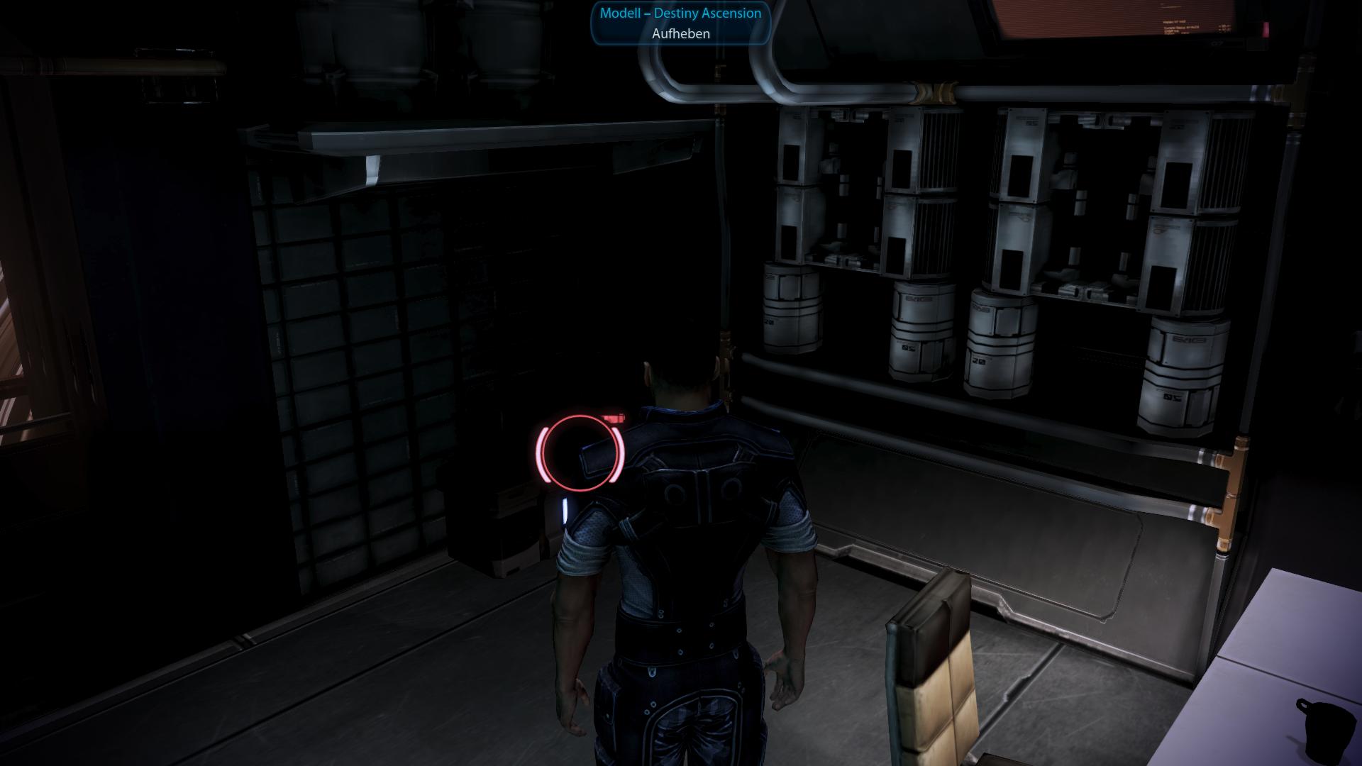 Fundort:Das Modell der Destiny Ascention liegt auf einer Kiste in einer Ecke von Thane Krios ehemaligem Raum (Lebenserhaltung) auf Deck 3. Geht vom Fahrstuhl aus nach rechts, an der Gedächtsniswand vorbei und die nächste Tür links rein. Das Model findet ihr an der linken Wand, wenn ihr bis zum Tisch durchlauft.