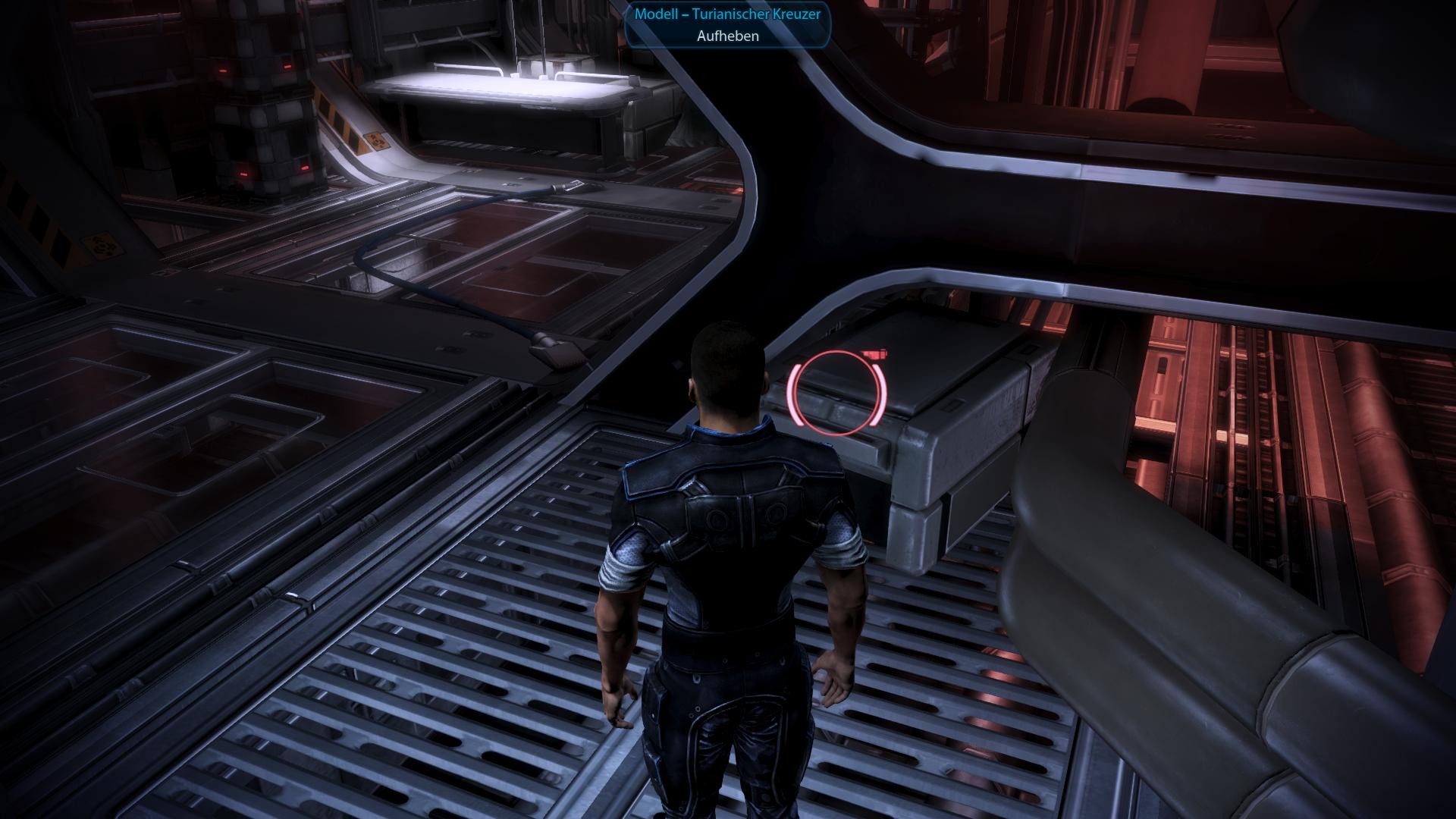 Fundort:Das Turianischer Kreuzer Modell befindet sich im Zwischendeck des Maschinenraums, wo Jack in Mass Effect 2 gelebt hat. Nehmt vom Fahrstuhl aus eine der seitlichen daneben gelegenen Türen, geht die Treppe runter und ihr seid auf der richtigen Ebene. Das Turianischer Kreuzer Modell liegt auf der vorderen Kiste