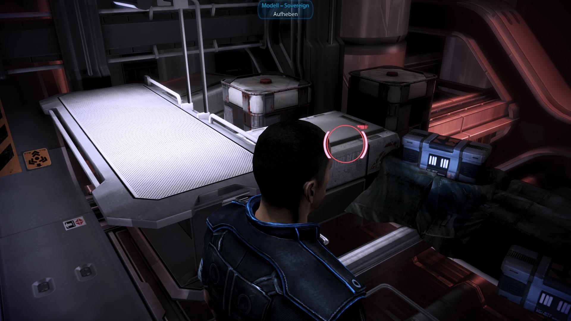 Fundort:Das Sovereign Modell befindet sich im Zwischendeck des Maschinenraums, wo Jack in Mass Effect 2 gelebt hat. Nehmt vom Fahrstuhl aus eine der seitlichen daneben gelegenen Türen, geht die Treppe runter und ihr seid auf der richtigen Ebene. In zentralen Gang/Raum hinter dem Tisch ist eine Kiste und auf der liegt das Modell.