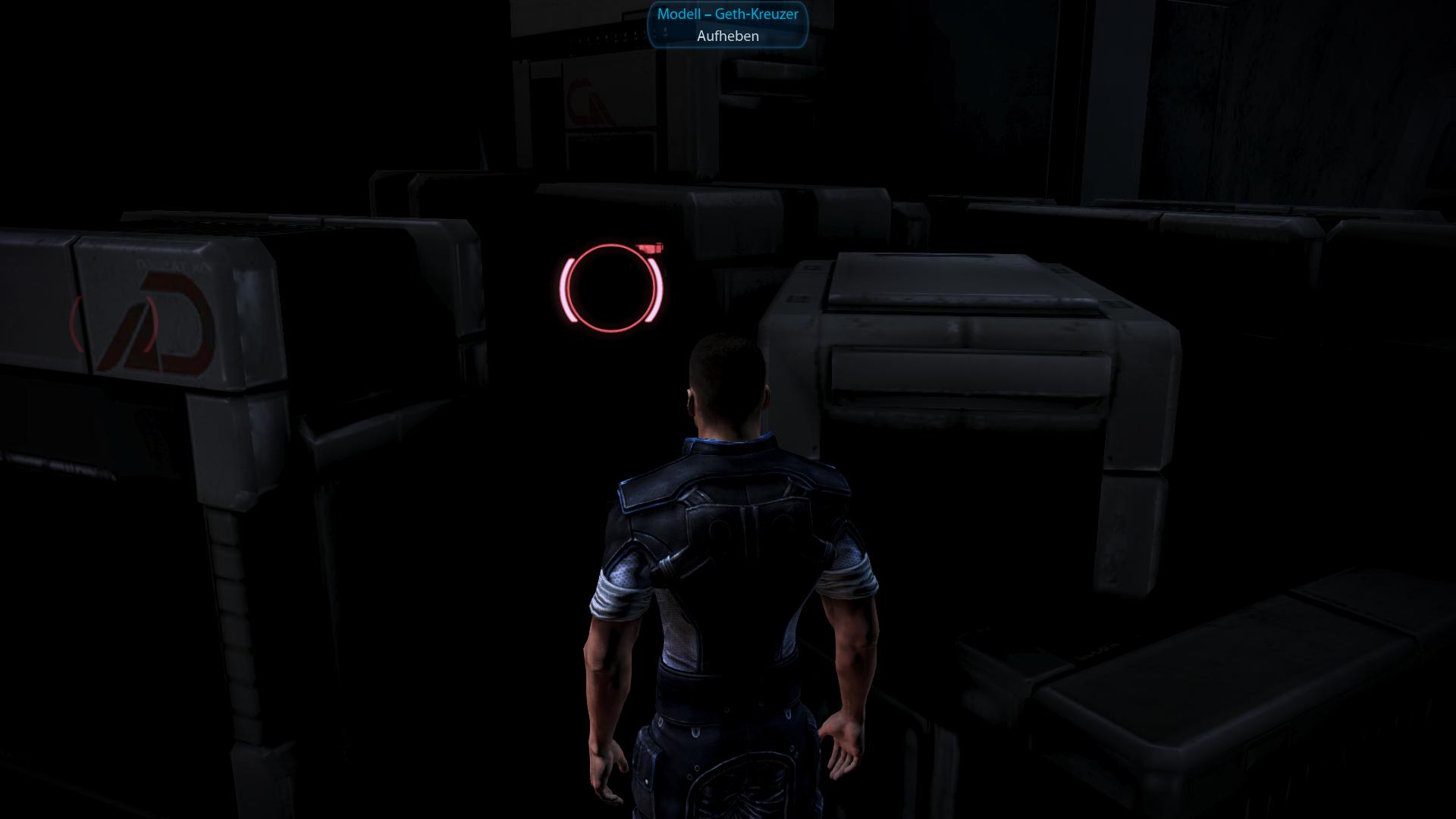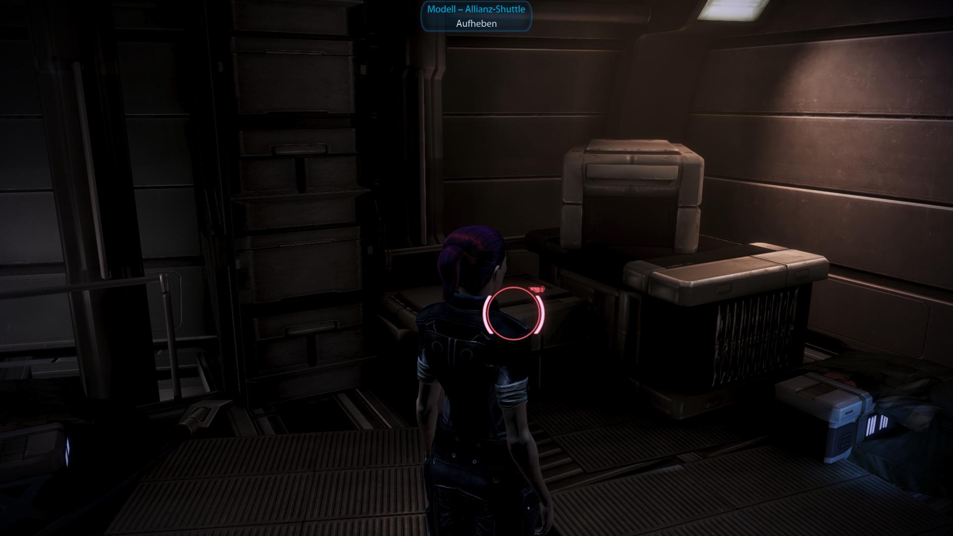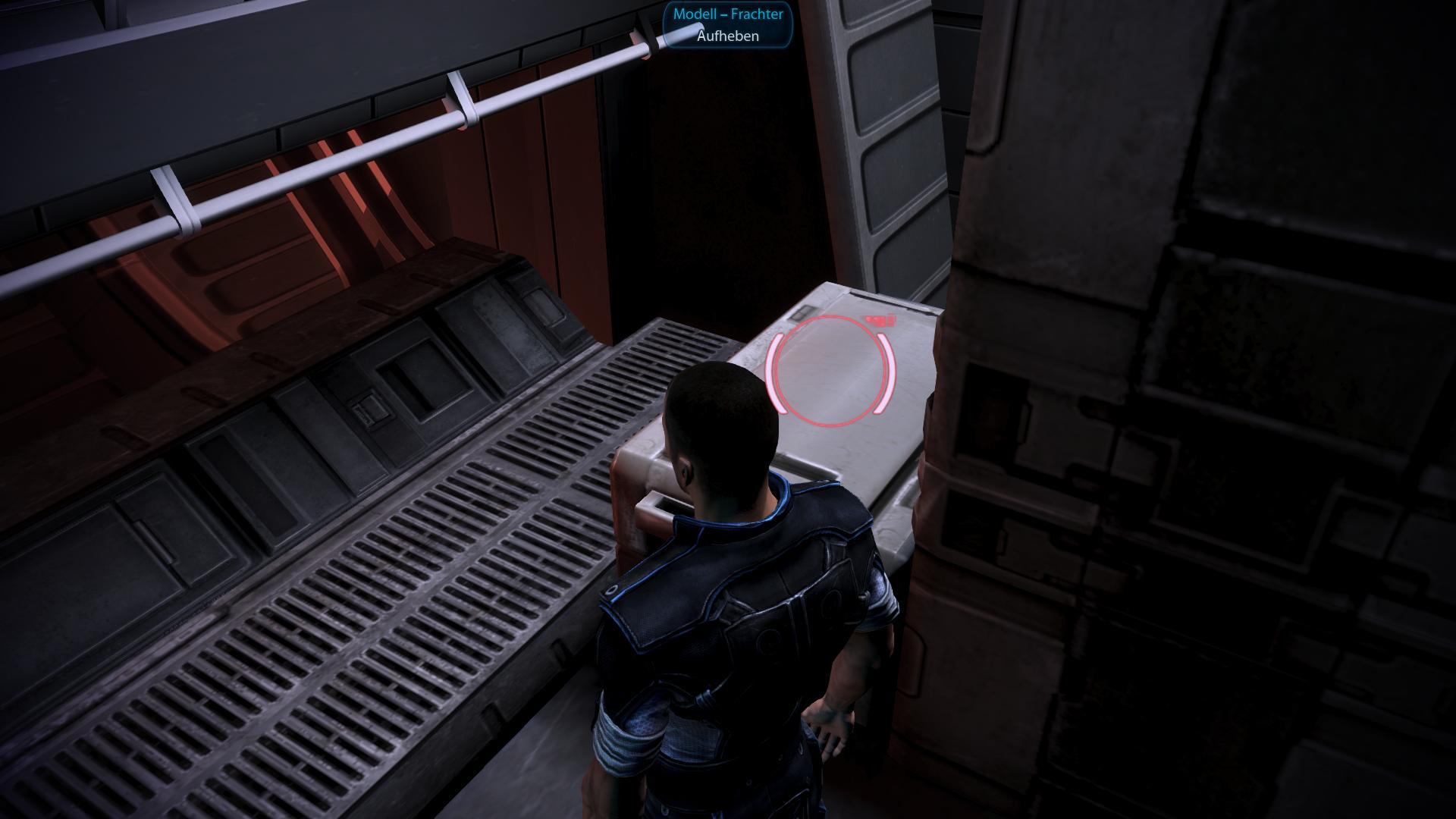 Fundort:Das Frachter-Modell liegt in der Shuttlebucht der Normandy. Fahrt mit dem Fahrstuhl auf Deck 5, dreht euch nach links zu den beiden Crewmen und geht zwischen ihnen und der Waffen-Mod-Station durch zu den Kisten. Das Frachter-Modell liegt sofort links auf der niedrigen Kiste nach der riesigen Kistenwand.