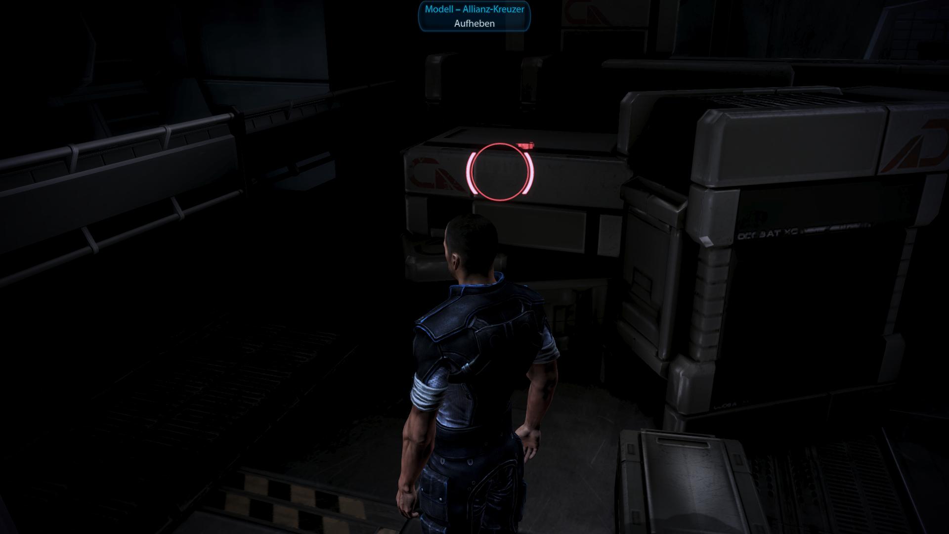 Fundort:Das Allianz-Kreuzer Modell liegt in der Shuttlebucht der Normandy. Fahrt mit dem Fahrstuhl auf Deck 5, dreht euch nach rechts zur Werkbank, lauft zwischen der und dem Panzerungsspind durch zu dem Kistenhaufen. In der hintersten Kiste auf der linken Seite des Haufens ist der Allianz-Kreuzer.