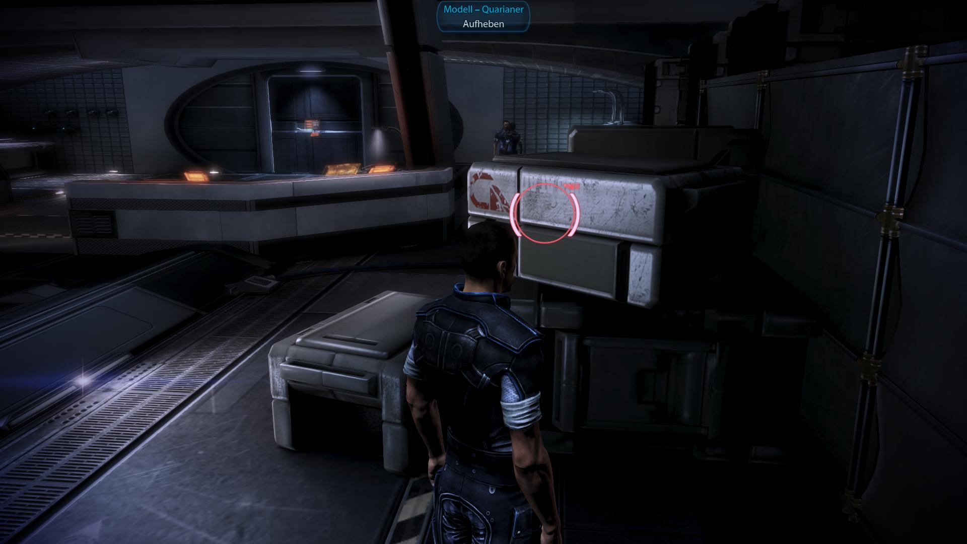 Fundort:Das Quarianer-Schiff-Modell liegt in der Shuttlebucht der Normandy. Fahrt mit dem Fahrstuhl auf Deck 5, lauft zwischen den Terminals durch und dreht euch sofort nach links zu den Kisten um. In der obersten ist das Quariaer Modell.