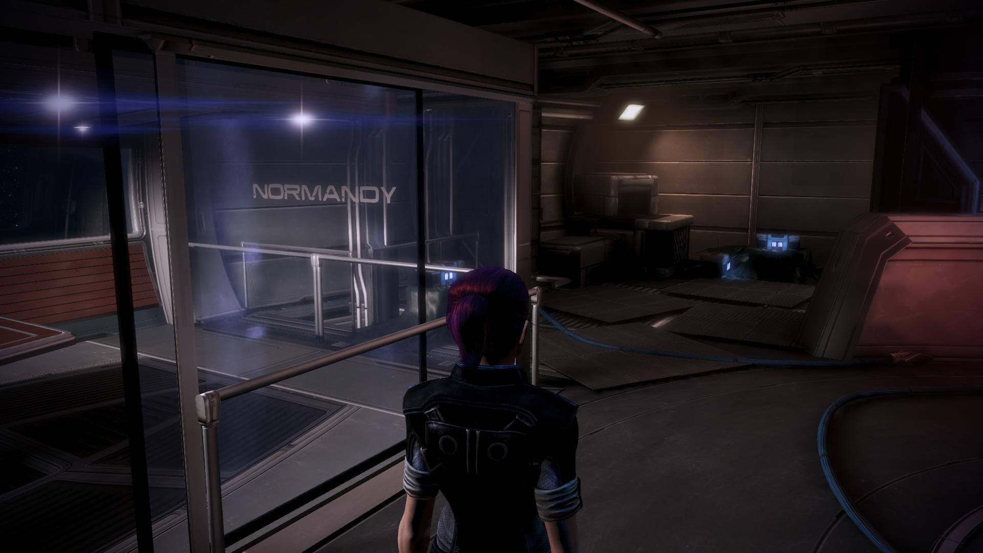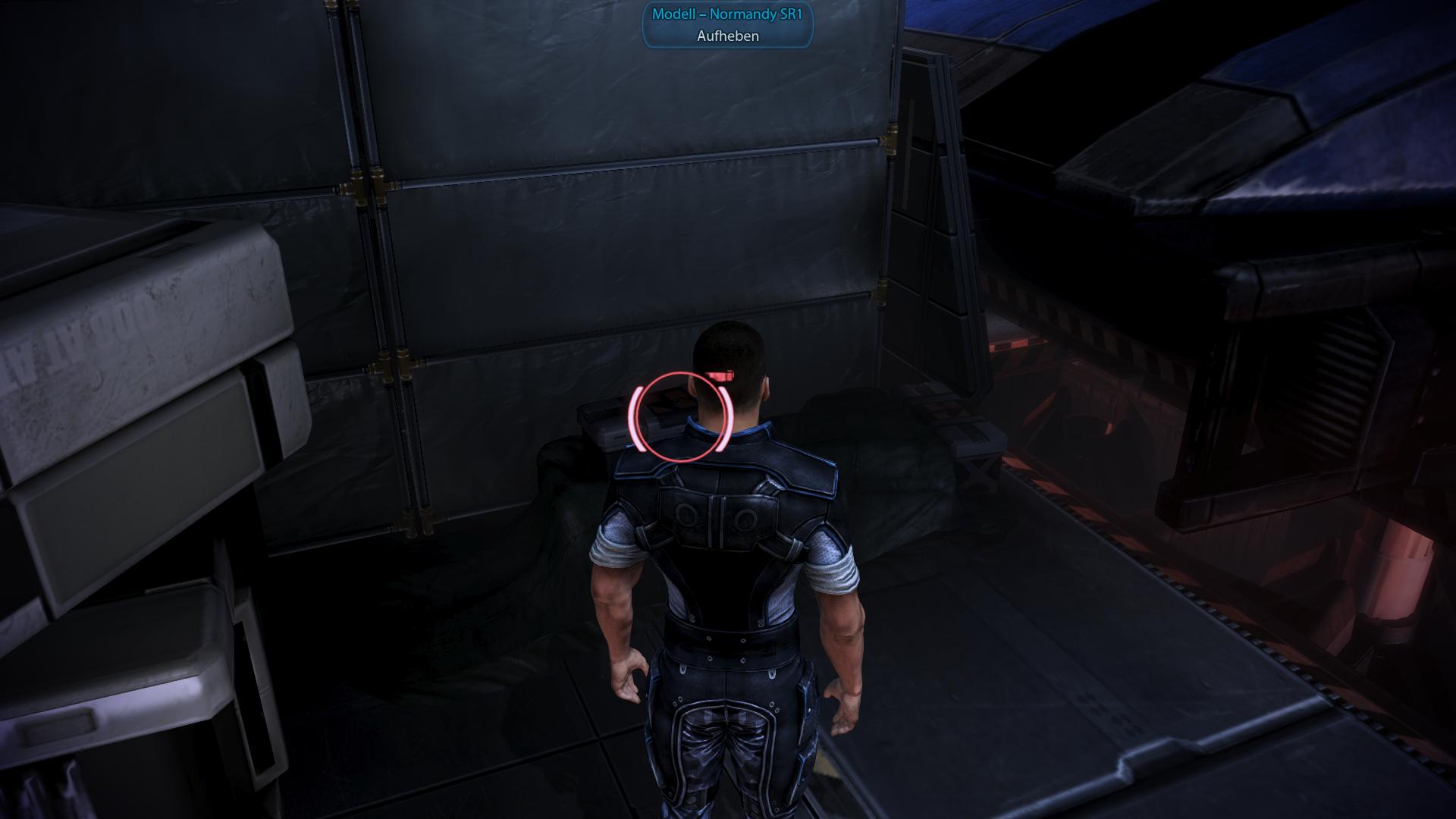 Fundort:Das Normandy SR-1 Modell liegt in der Shuttlebucht der Normandy. Lauft vom Fahrstuhl aus geradeaus an James Abteil vorbei zum zweiten grauen Kisten Haufen. Zwischen diesem Kistenhaufen und dem blauen Shuttle auf der linken Seite liegt das Normandy SR-1 Modell am Boden.