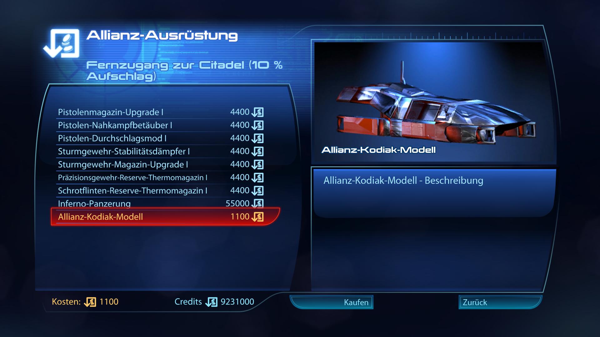 Fundort:Das Allianz-Kodiak-Shuttle-Modell könnt ihr im Anschluss an die "Priorität: Citadel (I)" Mission bei Kassa Fabrication oder mit 10% Aufpreis am Nachschub-Terminal der Normandy kaufen.