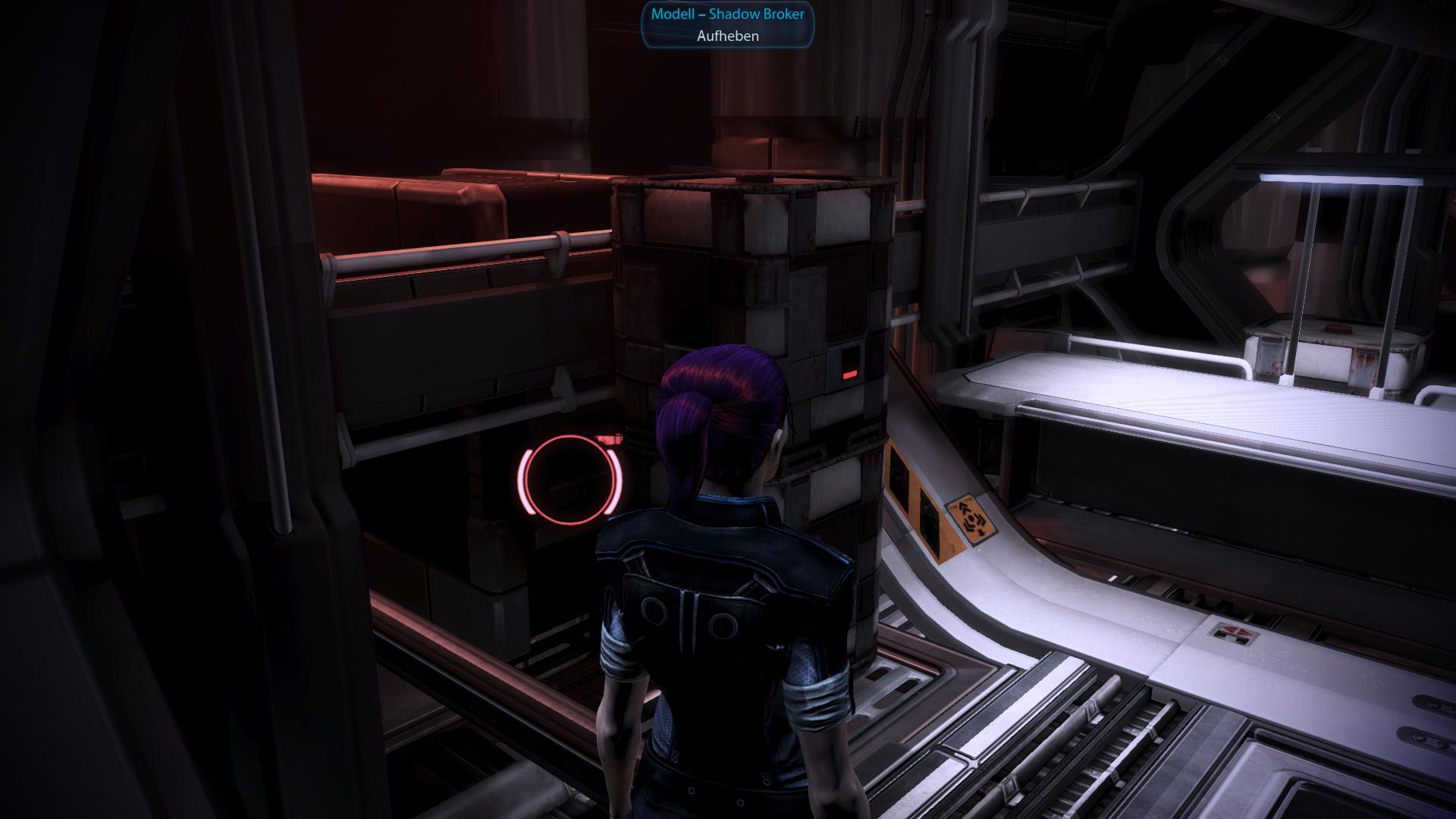 Fundort:Das Shadow Broker Base Modell ist im Zwischendeck des Maschinenraums versteckt, wo sich Jack in Mass Effect 2 aufgehalten hat. Nehmt vom Fahrstuhl aus eine der seitlichen daneben gelegenen Türen, geht die Treppe runter und ihr seid auf der richtigen Ebene. Das Shadow Broker Modell liegt links von dem Tisch in der Wand. Es ist jedoch nur auffindbar wenn in Mass Effect 2 der "Versteck des Shadow Broker" DLC (Lair of the Shadow Broker) durchgespielt wurde.
