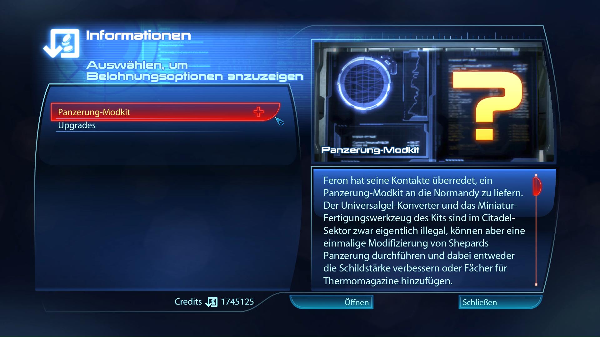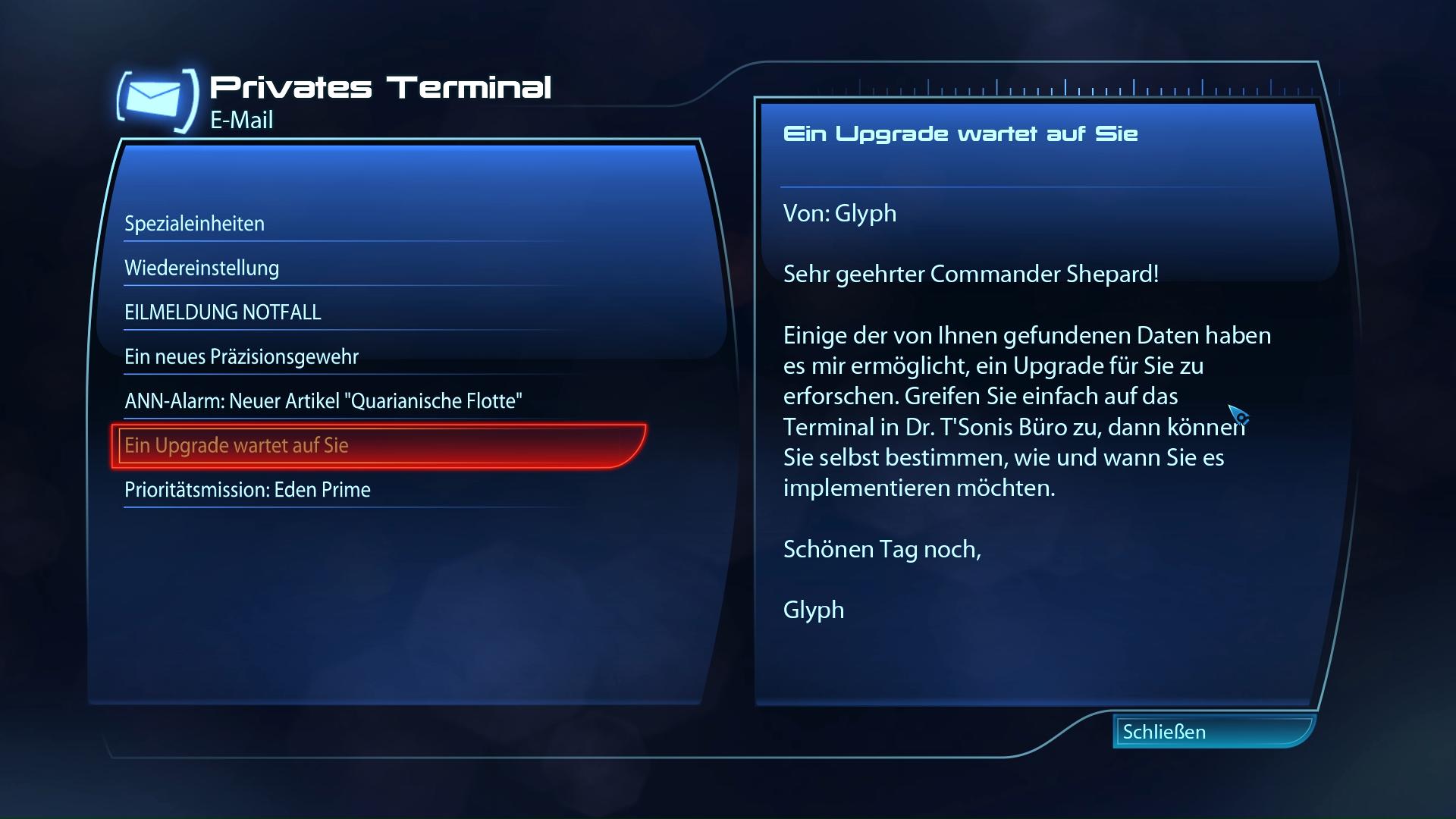 - Fundort:Dieses Upgrade erhaltet automatisch beim Betreten der Normandy (nach der Citadel im Prolog) und werdet zusätzlich noch mal durch eine E-Mail von Glyph darauf aufmerksam gemacht. Jedoch nur wenn ihr einen Mass Effect 2 Spielstand importiert habt, indem ihr das Shadow Broker DLC beendet habt.