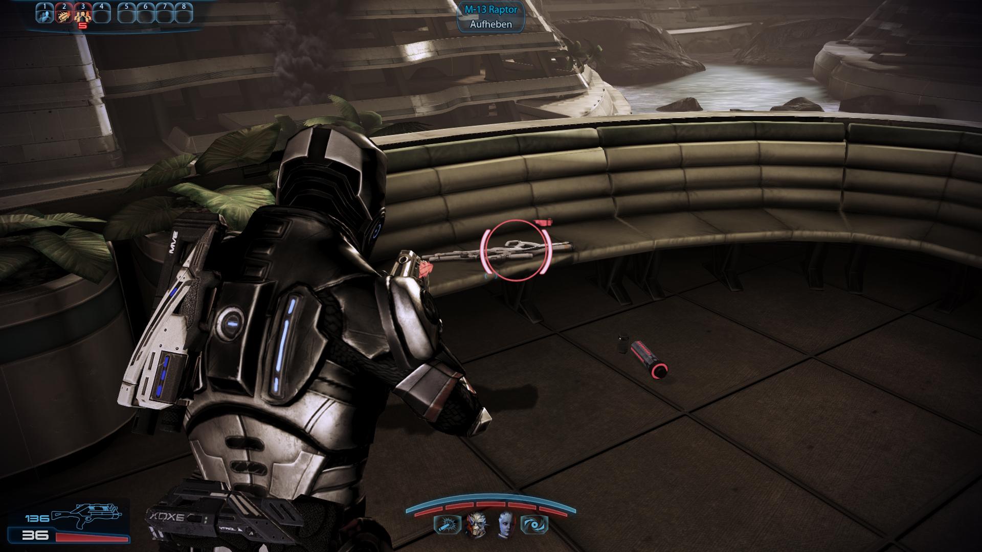Fundort:Das M-13 Raptor Scharfschützengewehr ist leicht zu verpassen. Es liegt auf der Ebene des zweiten Quarantänekontrollpunkts. Nachdem ihr am Energieterminal wart, dort die Scorpion Pistole gefunden habt und zurück zum Quarantänekontrollpunkt wollt, greifen euch erneut Cerberus-Soldaten an. Auf der Couch in der hinteren Ecke, wo die sich abgeseilt haben, liegt das M-13 Raptor.