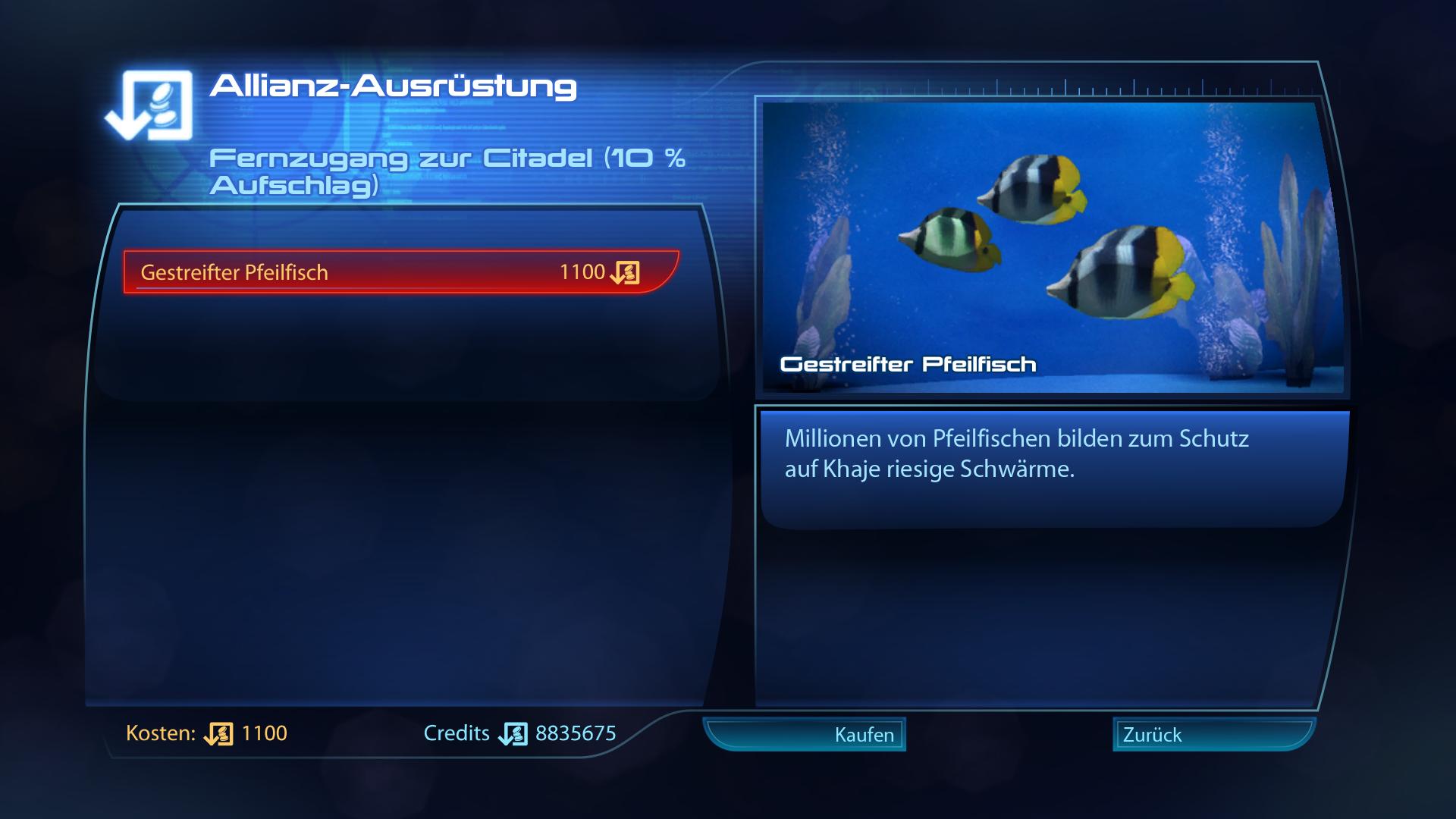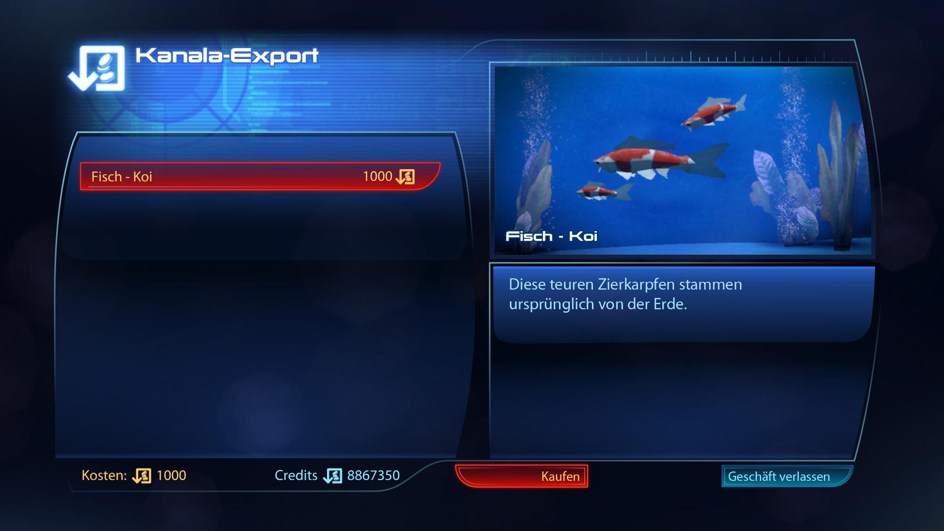 Fundort:Die Koi Fische könnt ihr für 1.000 Credits bei Kanala-Export kaufen, sobald ihr Zugang zum Präsidiumsunterhaus der Citadel habt (nach Priorität: Palaven). Der Kanala-Export Terminal befindet sich gleich links vom Fahrstuhl.