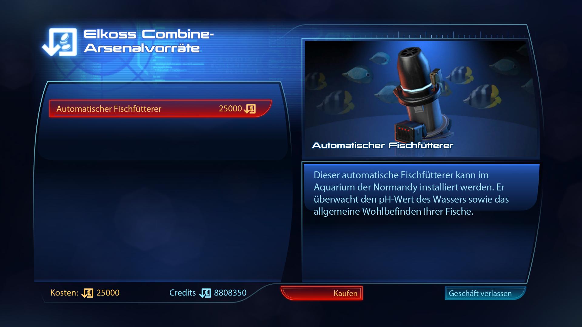 Fundort:Den automatischen Fischfütterer könnt ihr ab dem Abschluss der "Priorität: Palaven" Mission für 25.000 Credits bei Elkoss Combine-Arsenalvorräte im Präsidiumsunterhaus der Citadel kaufen. Er hält die gesamten gekauften Fische am Leben, damit ihr sie nicht bei jedem Aufenthalt auf der Normandy füttern müsst. Er ist äußerst hilfreich, wenn ihr das 13. und letzte Upgrade (Prejek Paddlefish Upgrade) erlangen wollt.