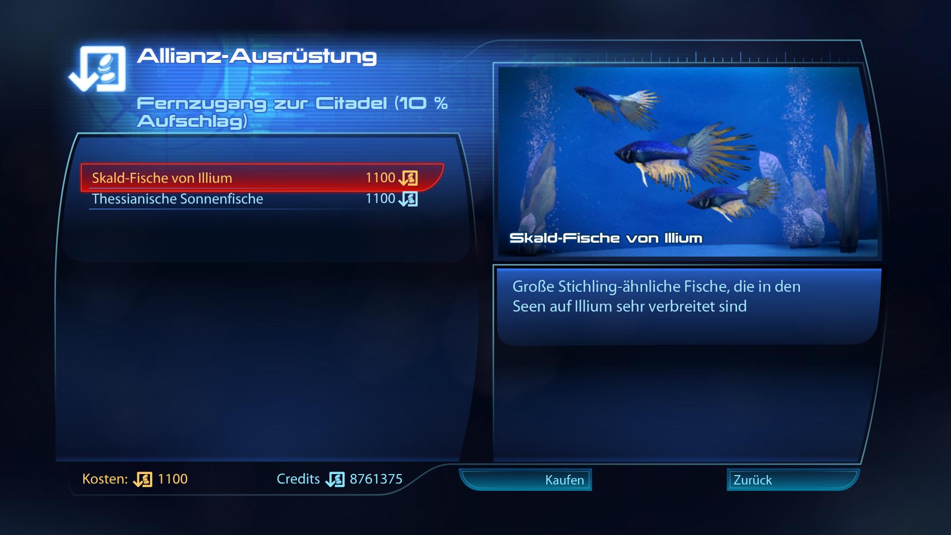 Fundort:Die Skald-Fische von Illium und Thessianischen Sonnenfische könnt ihr nach Abschluss der "Tuchanka: Bombe" Mission für 1.000 Credits bei Kanala Export erstehen.