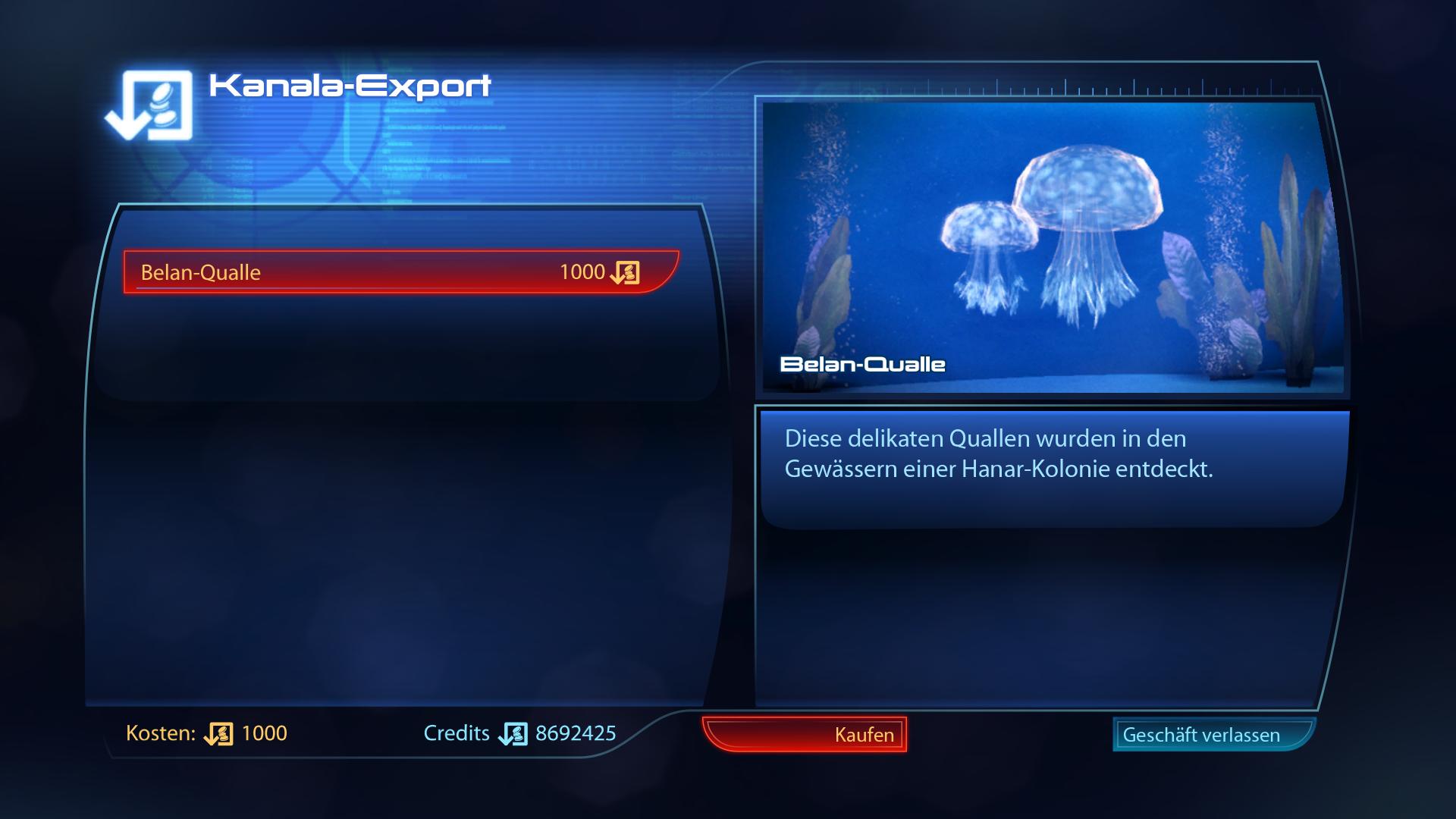 Fundort:Die Belan-Qualle ist nach der großen Schlacht auf der Citadel (Priorität: Citadel II) für 1.000 Credits bei Kanala-Export erhältlich.
