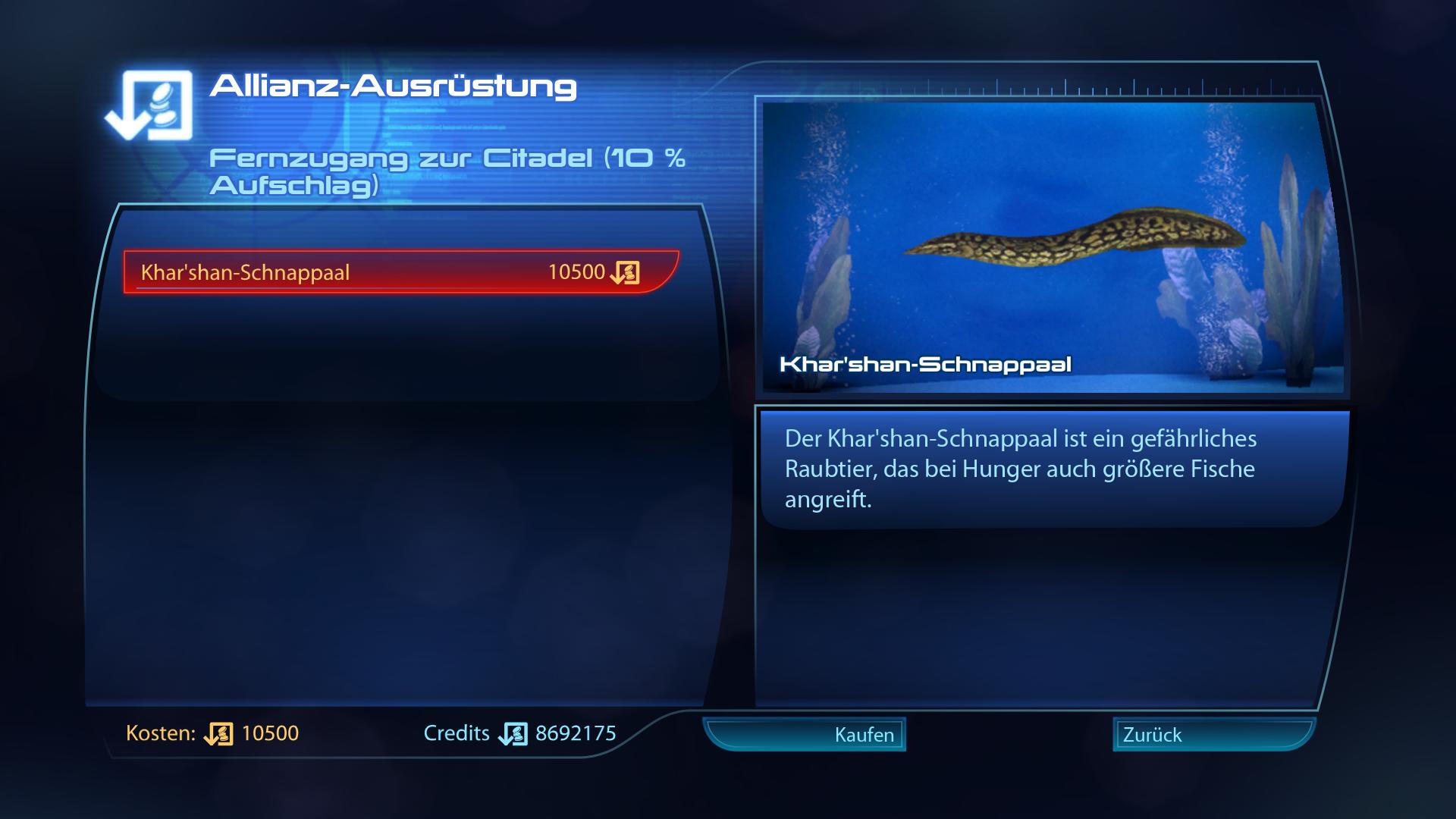 Fundort:Den Khar'shan-Schnappaal gibt es im Anschluss an die "Priorität: Geth-Schlachtschiff" Mission für 9.000 Credits bei Kanala-Export auf der Citadel zu kaufen.