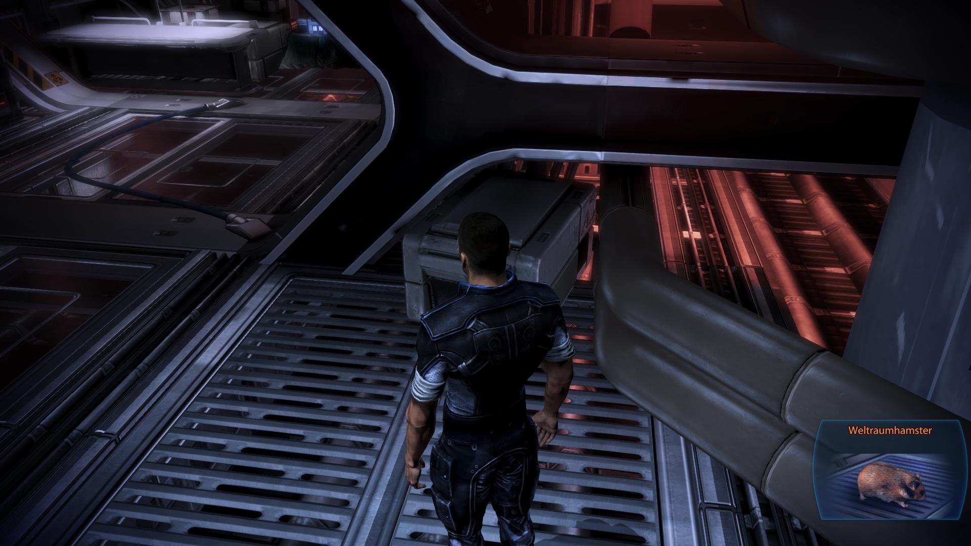 Fundort:Der Weltraumhamster konnte in Mass Effect 2 bei Citadel-Souvenirs gekauft werden. Er stand von da an in der Kabine des Captains und musst entgegen der Fische nicht gefüttert werden. Wurde der Hamster erworben, rennt er in Mass Effect 3 durch das unterste Deck des Maschinenraums (wo Jack gelebt hat). Gelingt es euch, den Weltraumhamster wieder einzufangen, könnt ihr ihn erneut in der Kapitänskabine platzieren.