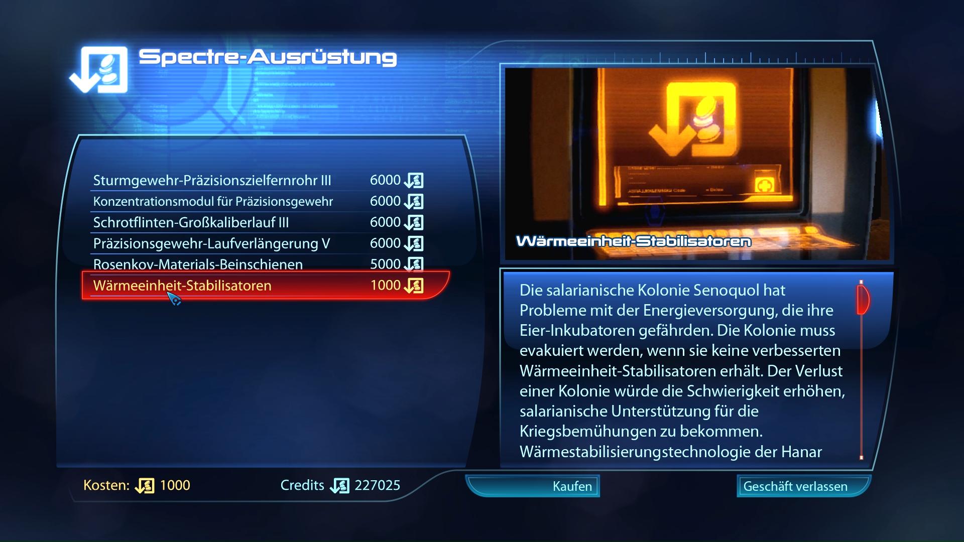 Fundort:Bereits nach Abschluss der Priorität: Palaven Hauptmission könnt ihr im Präsidium-Unterhaus auf der Citdel vor dem C-Sicherheit Büro einen Salarianer namens Sellea treffen, der euch die "Citadel: Wärmeeinheit-Stabilisatoren" (Citadel: Heating Unit Stabilizers) Mission gibt. Die Mission kann jedoch erst nach der "Priorität: Tuchanka" Hauptmission abgeschlossen werden. Entweder indem ihr die Pläne von der "N7: Cerberus-Jägerbasis" holt oder danach für 1.000 Credits am Spectre-Ausrüstung-Terminal kauft. Sobald ihr die Pläne Sellea übergebt, wird euch der Kriegsaktivposten gutgeschrieben.