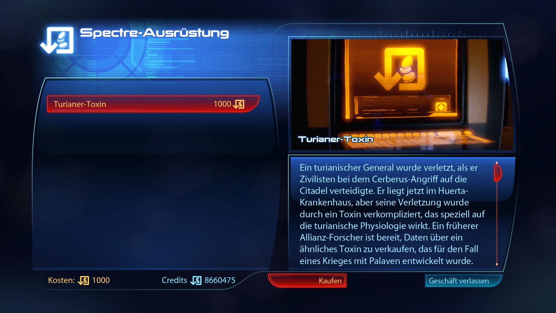 Beschreibung:Commander Shepard hat aus einem Cerberus-Labor ein Nervengift beschafft, mit dessen Hilfe ein Gegengift für einen vergifteten turianischen General hergestellt wird. Mission: Citadel: Cerberus-Gift für Turianer
