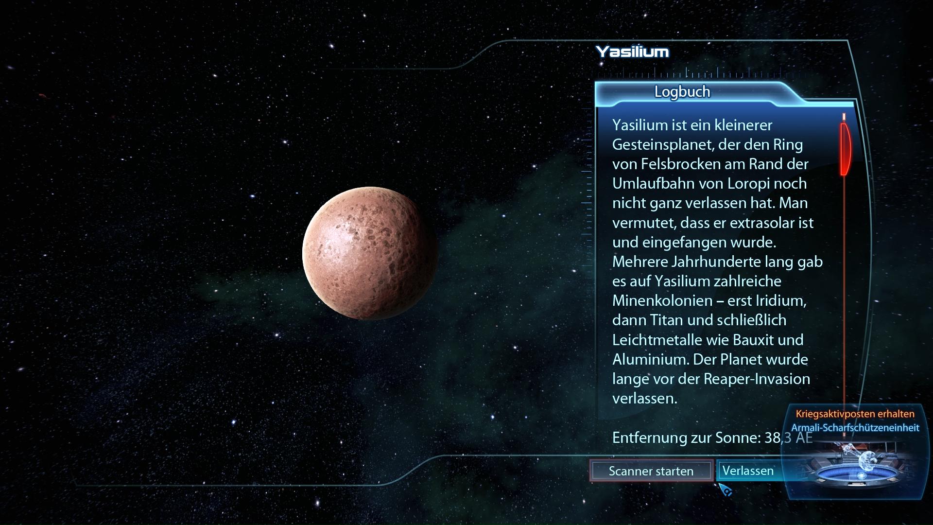 Fundort:Erst nach der "Priorität: Rannoch" Mission wird das Loropi-System des Silean-Nebels zugänglich. Fliegt dort hin und scannt den letzten Planeten Yasilium. Das bringt euch die Armali-Scharfschützeneinheit der Asari ein.