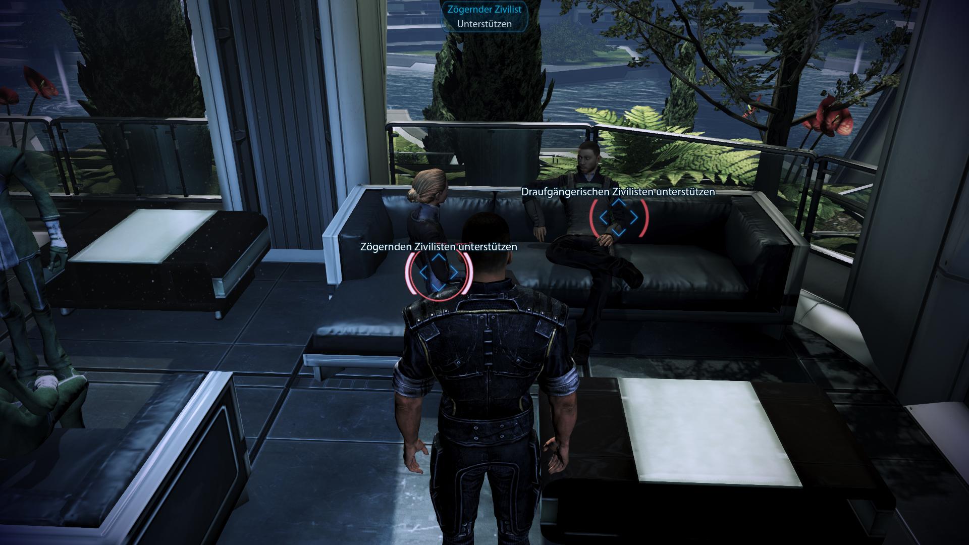 Fundort:Ab dem ersten Besuch des Präsidium Unterhauses sitzen in der Lounge links vom Fahrstuhl eine zögernde Zivilistin und ein draufgängerischer Zivilist. Ihr könnt einen von beiden unterstützen. Wählt "Zögernden Zivilist unterstützen" um den Bonus zu erhalten.