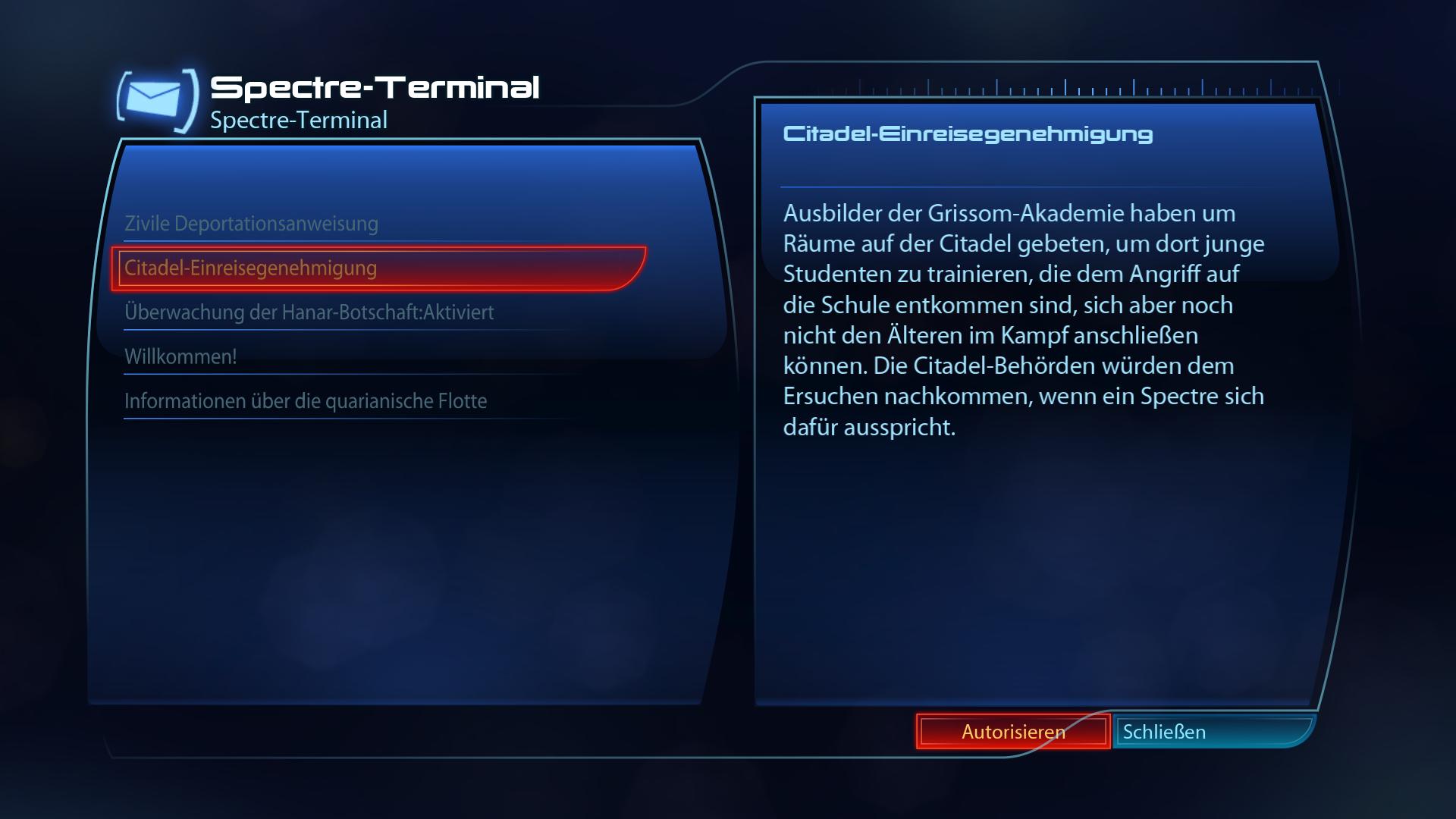 Fundort:Mit Abschluss der "Priorität: Palaven" Mission wird die "Grissom-Akademie: Notevakuierung" (Grissom Academy: Emergency Evacuation) verfügbar. Sobald diese abgeschlossen ist, gibt es im Spetre-Terminal bei der Citadel-Botschaften die "Citadel-Einreisegenehmigung" (Citadel Entry). Autorisiert sie und ihr erhaltet die Kriegsaktivposten.