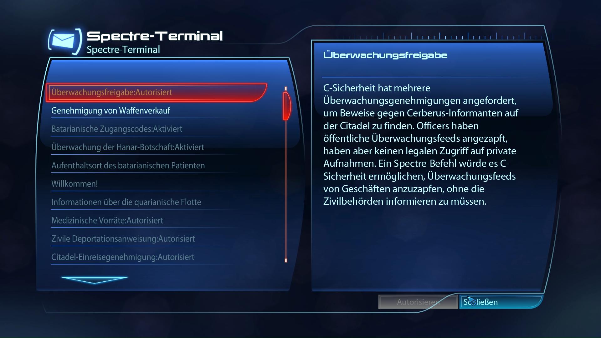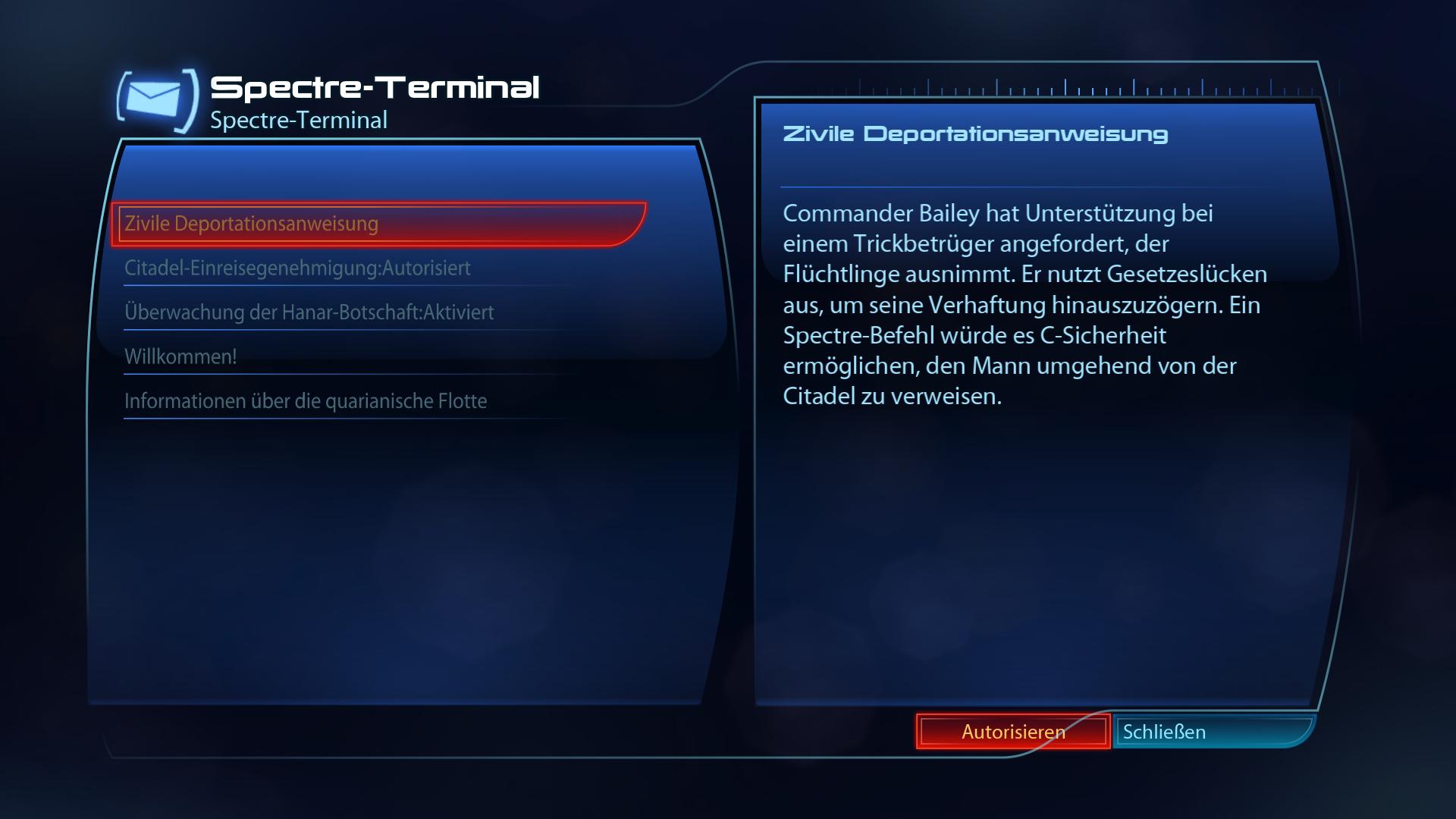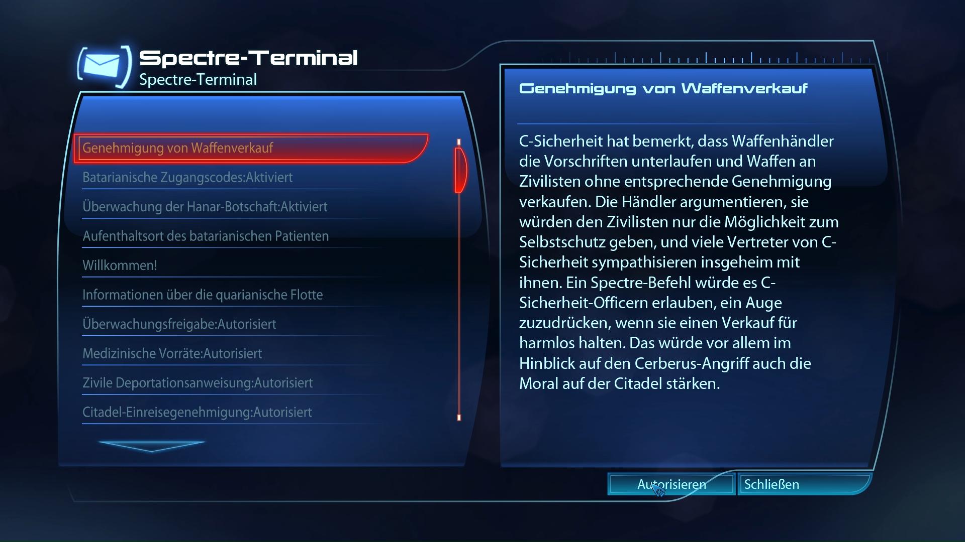 Fundort:Nach dem Priorität: Citadel (II) Einsatz liegt am Spectre-Terminal eine "Überwachungsfreigabe" vor. Autorisiert ihr sie, erhaltet ihr diesen Kriegsaktivposten.