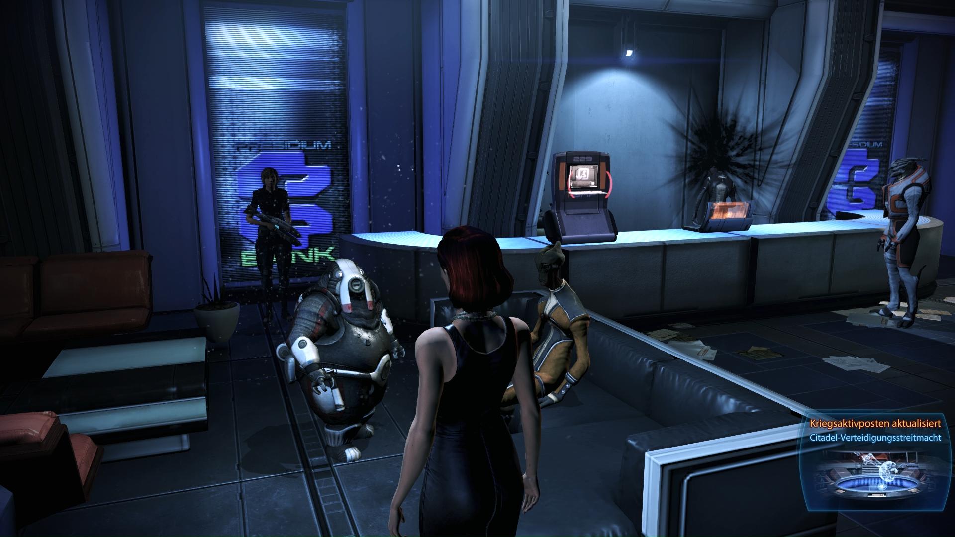 Beschreibung:Nach Versicherungen, dass es für die Kriegsbemühungen entscheidend ist, sein Geld auf der Bank zu lassen, haben Volus-Händler für Hilfsprojekte und die Verteidigungstruppen auf der Citadel gespendet.