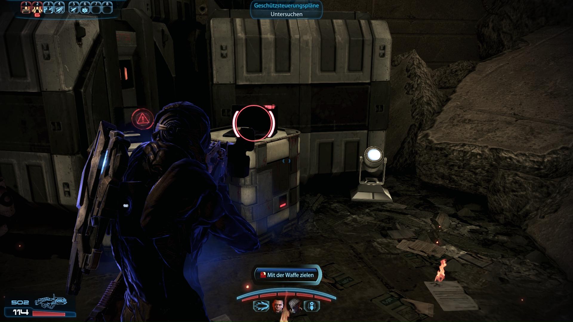 Fundort:Am Ende der "Tuchanka: Bombe" Mission, was die Nachfolge der "Tuchanka: Turianischer Zug" ist, entdeckt ihr unmittelbar vor Erreichen der Bombe auf einer Kiste "Geschützsteuerungspläne". Diese könnt ihr später nach Abschluss der "Priorität: Citadel (II)" Mission dem C-Sicherheit-Officer auf dem obersten Balkon des Präsidiumunterhauses der Citadel übergeben (Citadel: Steuerungspläne für automatische Geschütze von Cerberus), um diesen Kriegsaktivposten freizuschalten.