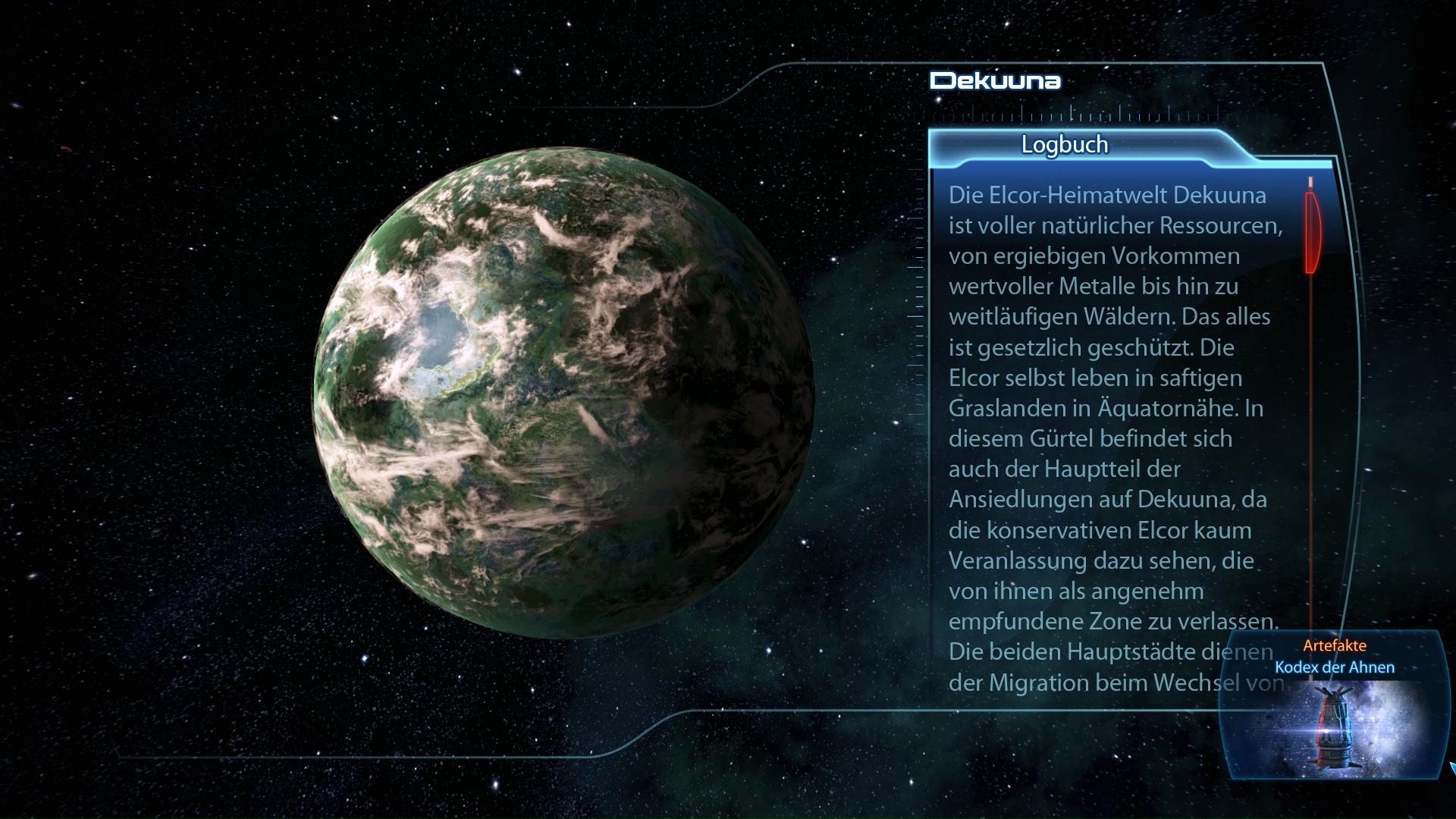 Fundort:Der Elcor vor der Purgatory Bar auf der Citadel erzählt schon relativ früh vom Kodes der Ahnen auf Dekuuna (Dekuuna: Code of the Ancients). Die Mission lässt sich jedoch erst nach "Priorität: Rannoch" abschließen, da ihr erst dann Zugriff auf alle Systeme des Silean-Nebels habt. Fliegt also in dem Cluster zum Phoetes System und scannt den grünen Planeten Dekuuna. Bringt den Kodex der Ahnen anschließend zum wütenden Elcor zurück und ihr bekommt diesen Kriegsaktivposten gutgeschrieben.