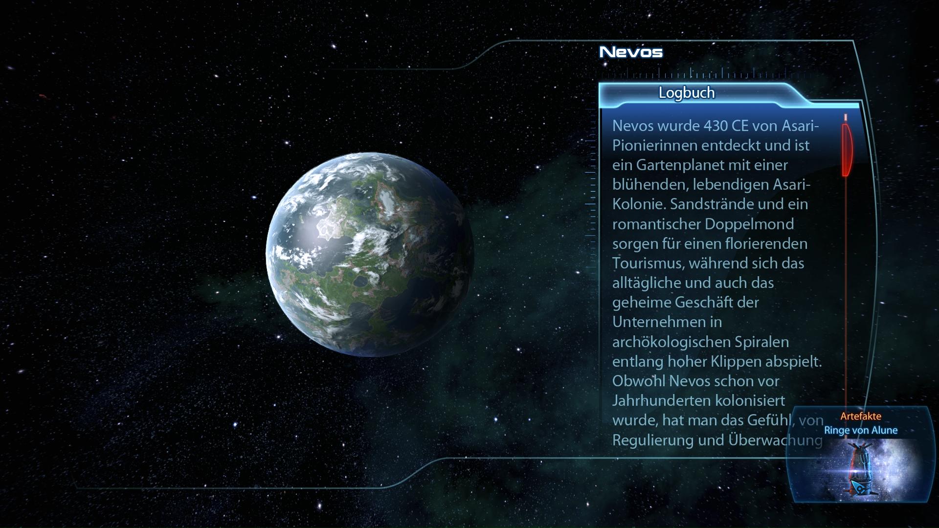 Fundort:Wie der Kodex der Ahnen, sind auch die Ringe von Alune im Silean-Nebel zu finden (Silean Nebula: Rings of Alune). Obwohl ihr die Mission bereits nach "Priorität: Citadel (II)" im Huerta-Krankenhaus bekommt, könnt ihr sie erst zwei Hauptgeschichtsmissionen später beenden. Habt ihr also nach "Priorität: Rannoch" Zugang zum Silean-Nebel, dann fliegt dort zum Teyolia System und scannt den zweiten Planeten Nevos. Bringt sie dem Asari Berater am Fahrstuhl des Huerta-Krankenhauses und ihr bekommt diesen Aktivposten.